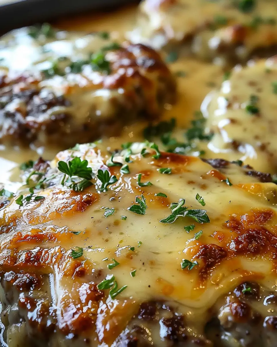 Preheat your oven to 350°F (175°C). In a baking dish, arrange the seared patties and pour the luscious gravy over the top. If you want your bake to have a little extra creaminess, add the milk at this stage.