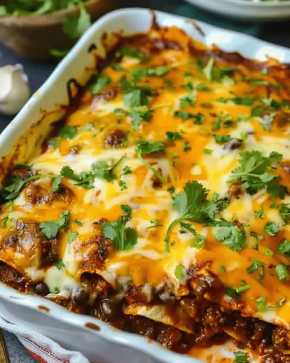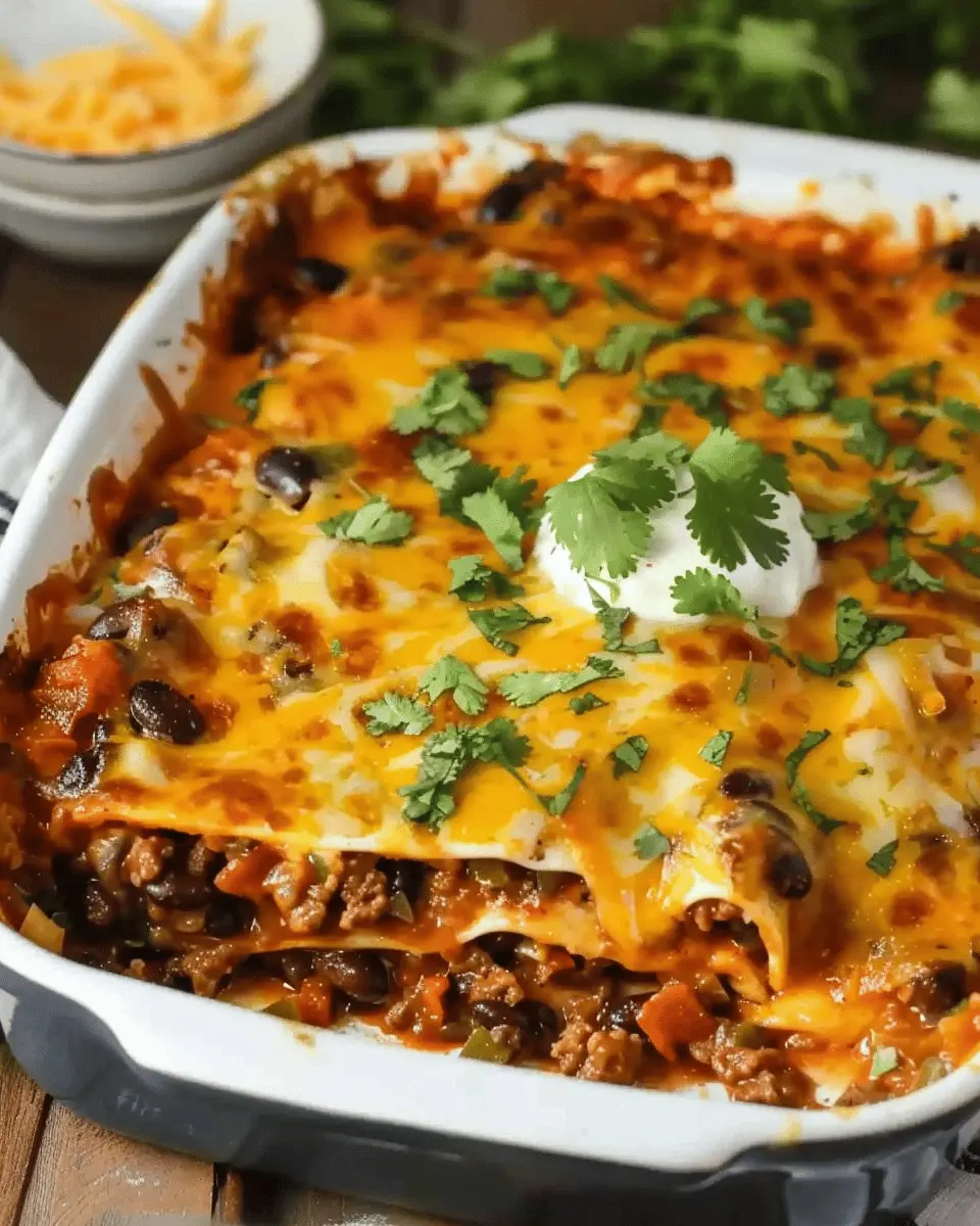 A comforting and delicious beef enchilada casserole that is easy to make and perfect for family dinners.