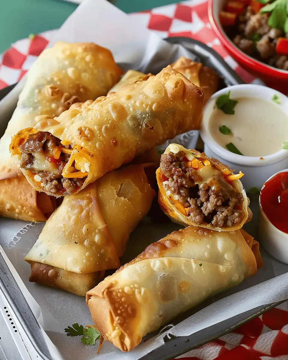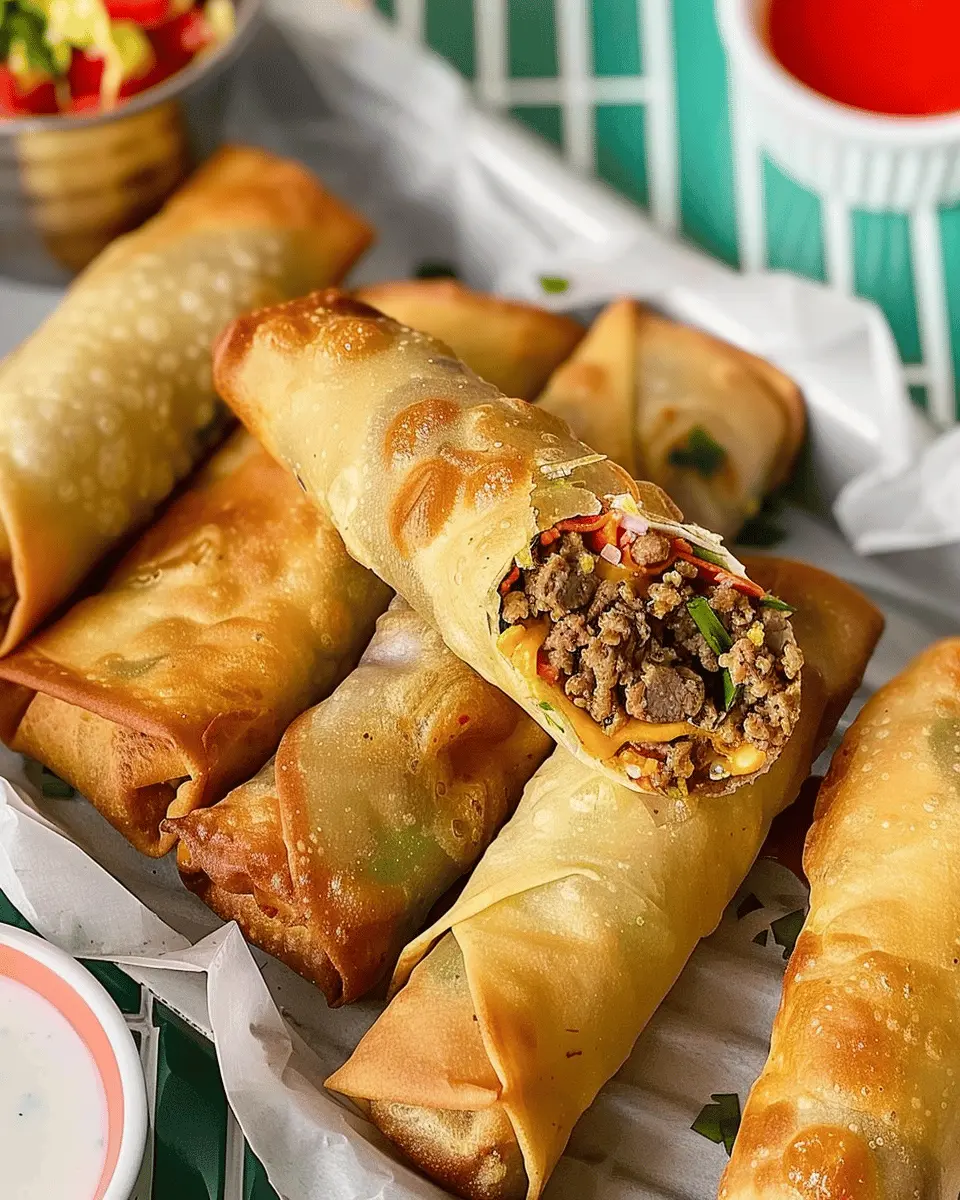 PrintCheeseburger Egg Rolls: Easy, Juicy Bites for Burger Lovers