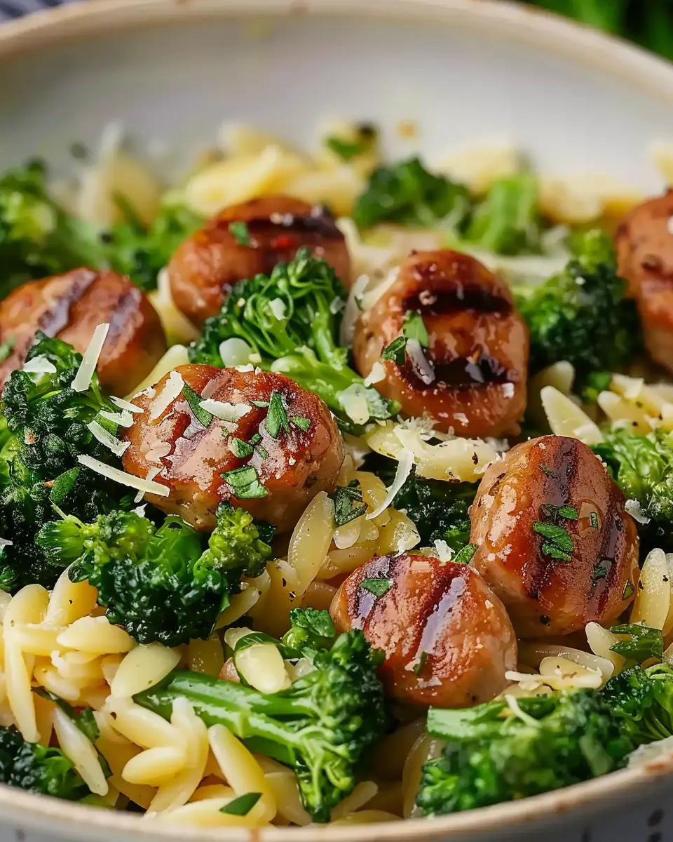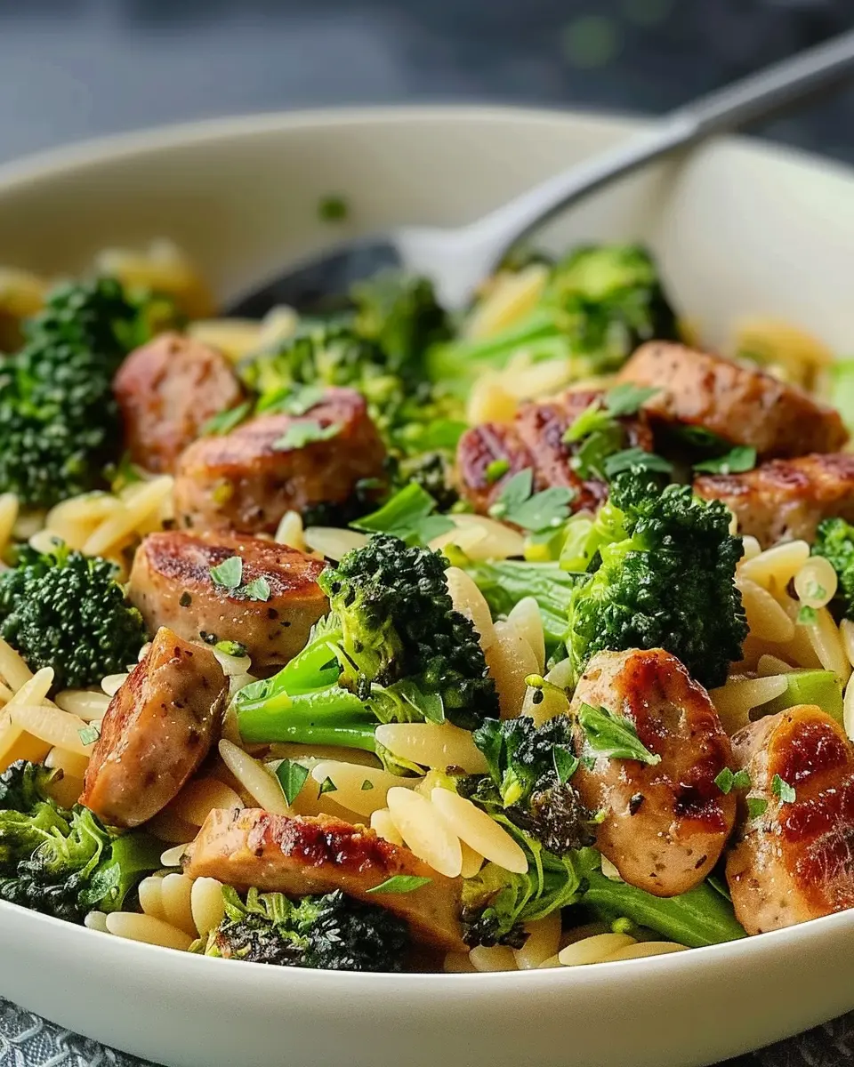 A delicious and nutritious dish featuring chicken sausage, broccoli, and orzo pasta.