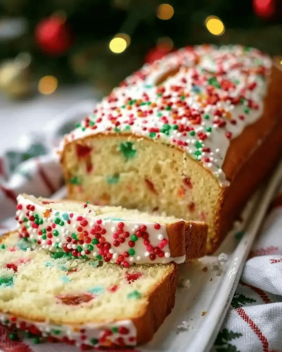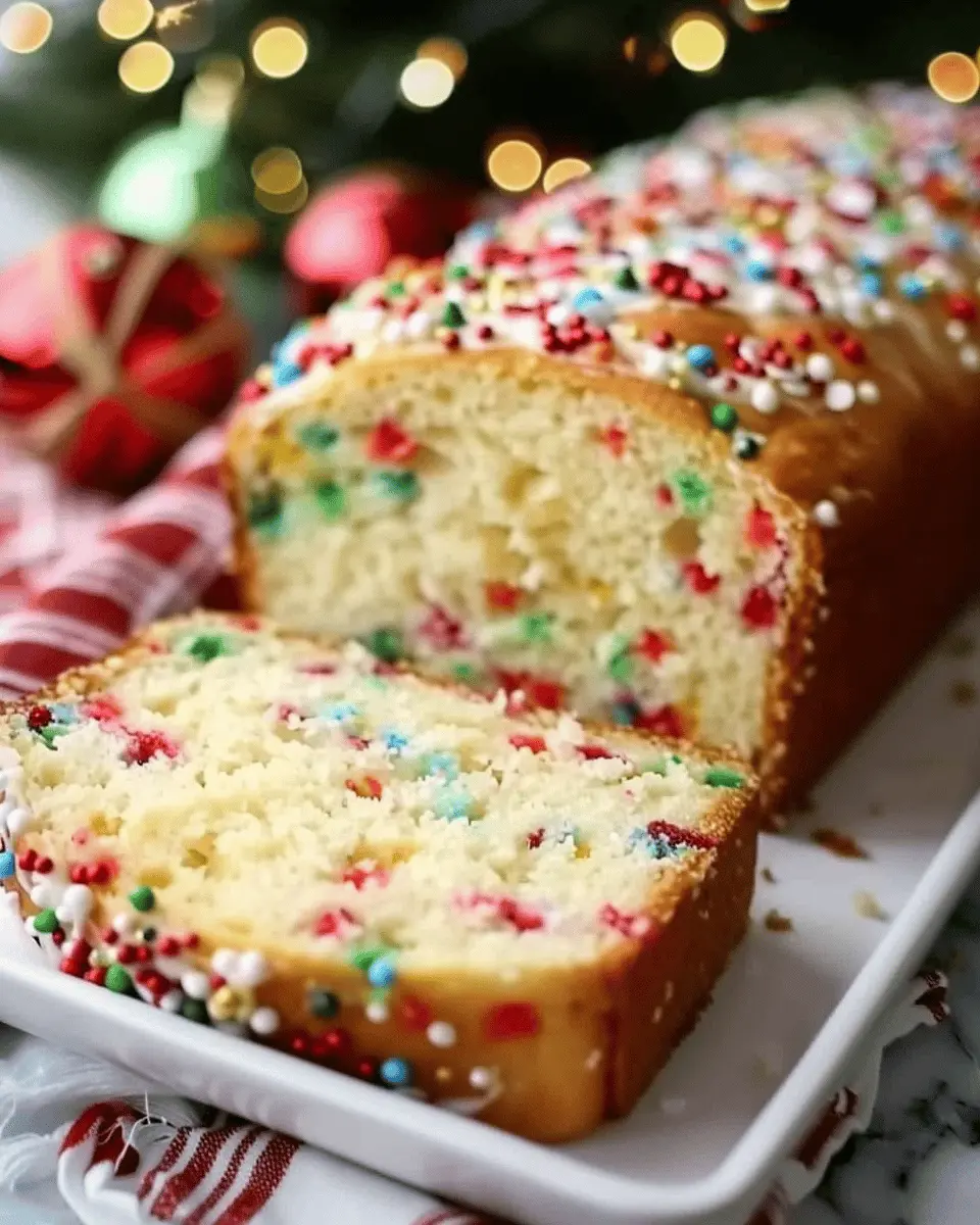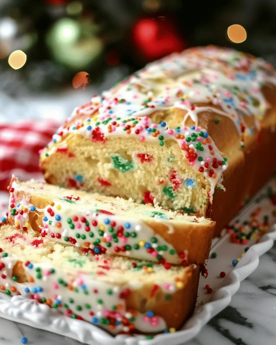 Your holiday celebrations deserve a standout dish, and Christmas Sprinkle Buttermilk Bread is perfect for potlucks or festive brunches. Cut it into mini loaves or muffins for easy sharing, and consider a beautiful presentation on a festive platter. Drizzle a simple vanilla glaze over the top or sprinkle with powdered sugar for an elegant finish. For drinks, serve it with spiced apple cider or a rich hot chocolate to warm everyone’s spirits. This recipe is not just food; it’s a centerpiece of joy that sparks conversations and creates lasting memories.