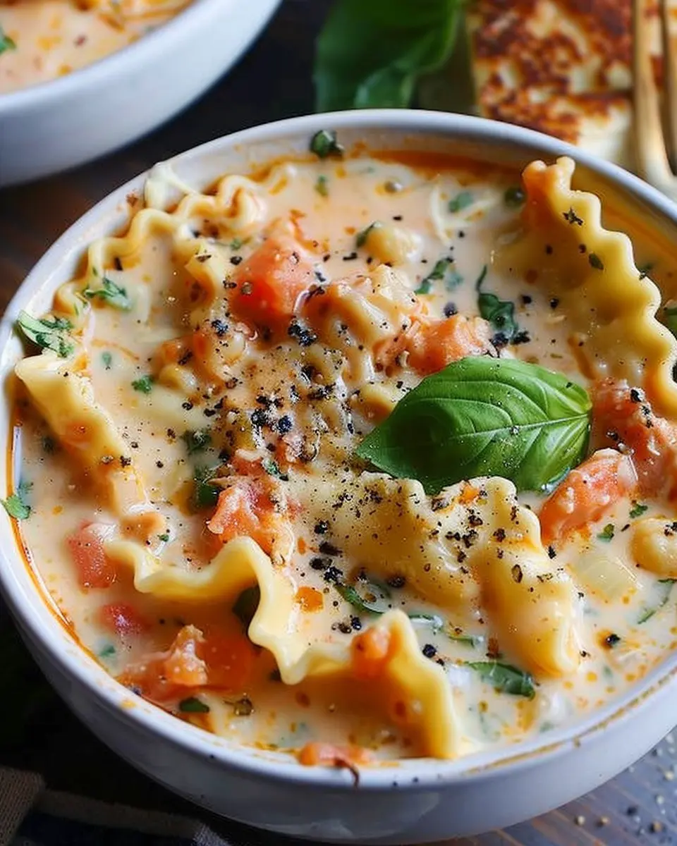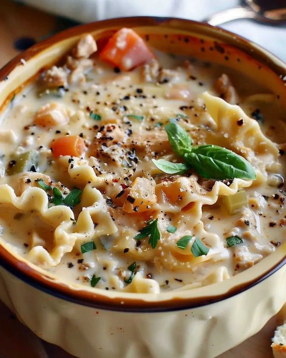 Indulge in a warm and hearty bowl of creamy chicken lasagna soup, perfect for any occasion.