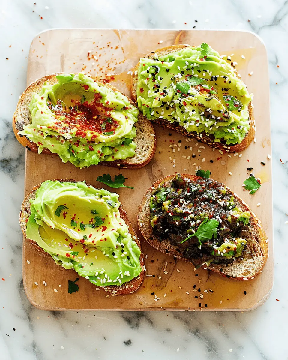 For those who crave heat, spicy toppings like Sriracha or chili flakes are a must. A drizzle of Sriracha adds not only heat but also a tangy depth that complements the creaminess of the avocado. Don’t be afraid to sprinkle a bit of chili flakes on top for an extra kick!