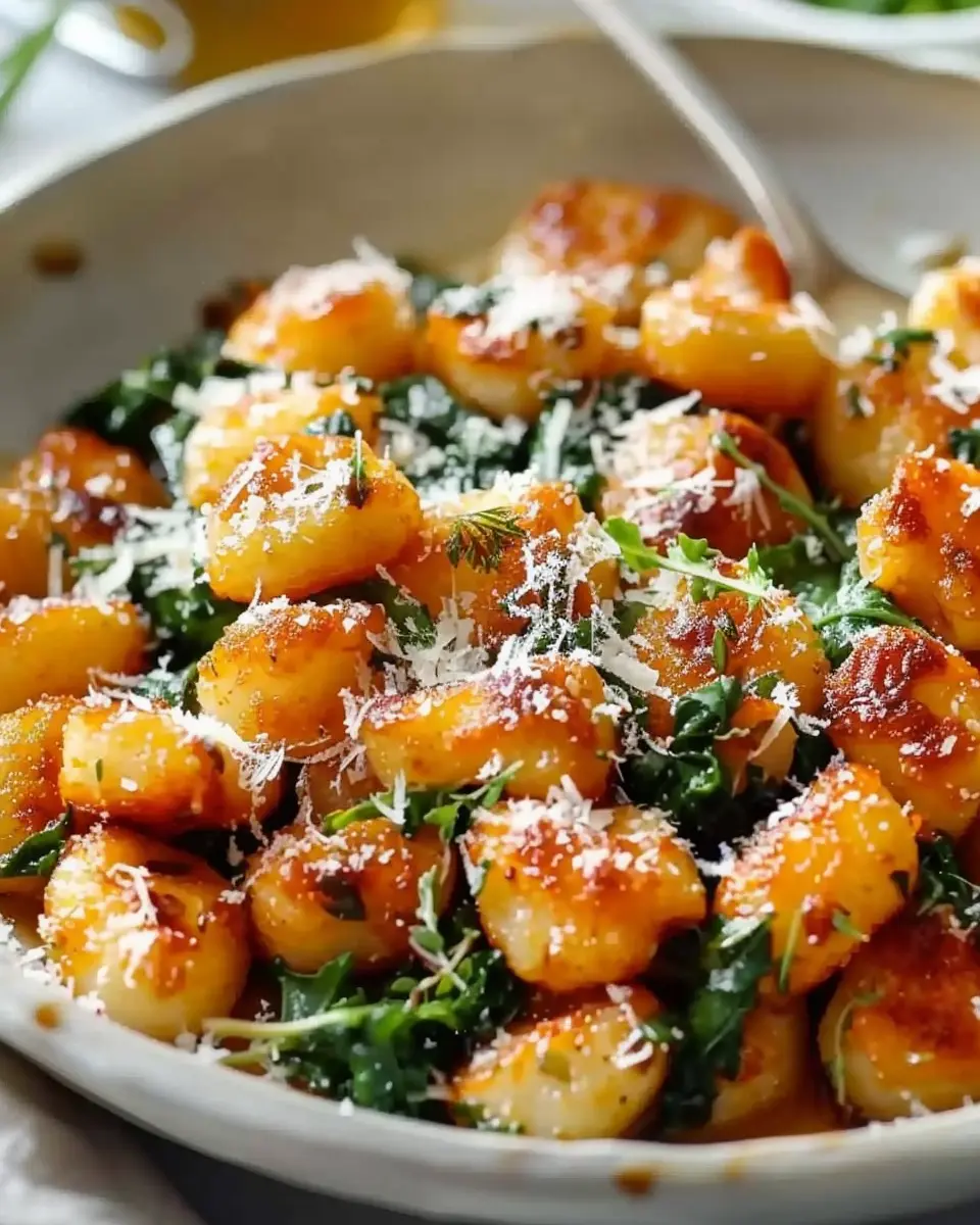 Now for the best part—serving it up! Plate your crispy gnocchi with spinach and feta and make it visually appealing. Drizzle with a little olive oil or a squeeze of fresh lemon for brightness. You could even sprinkle some chili flakes for a little kick.
