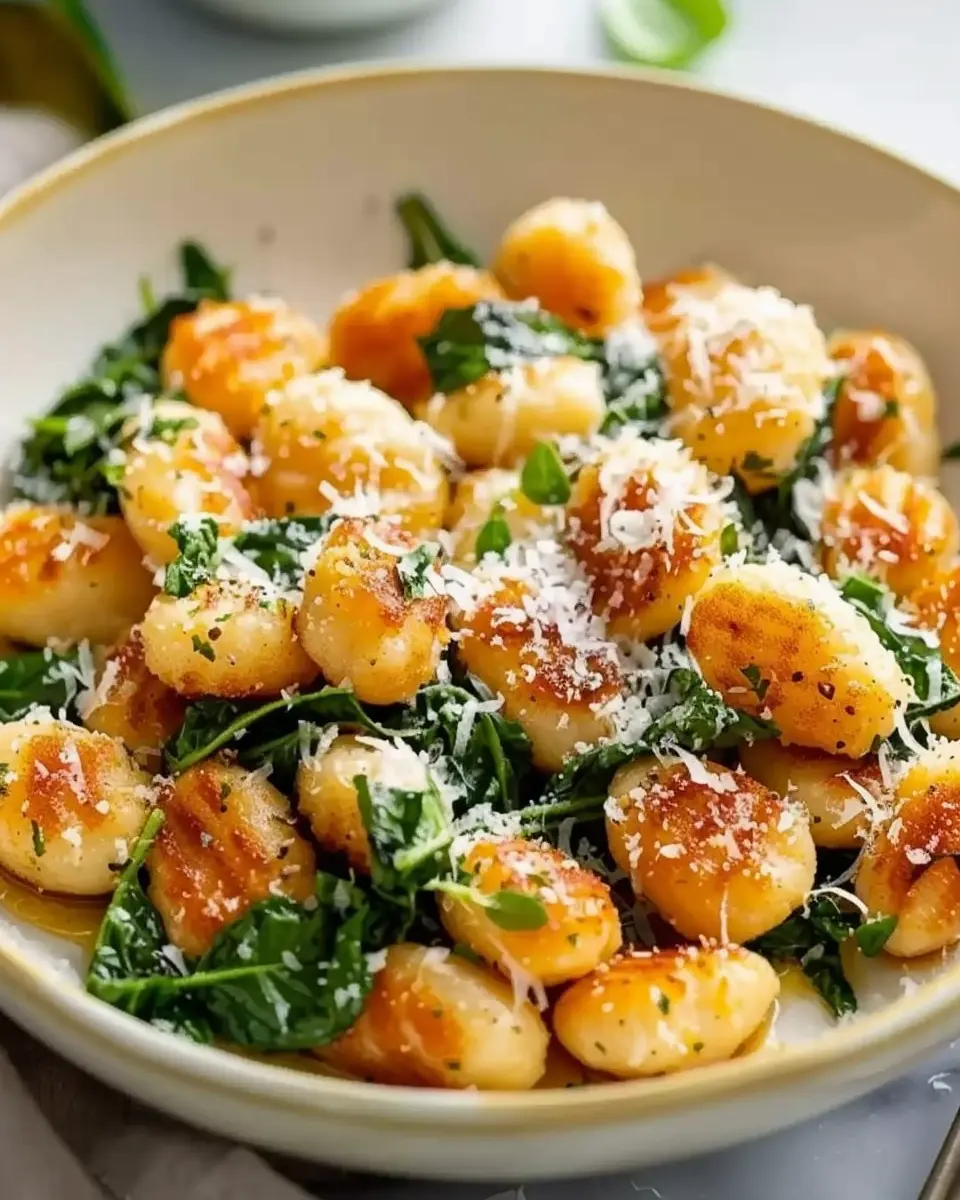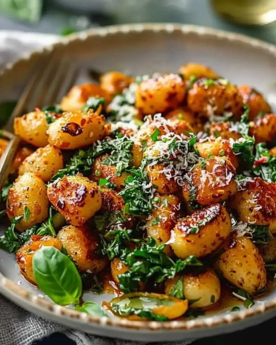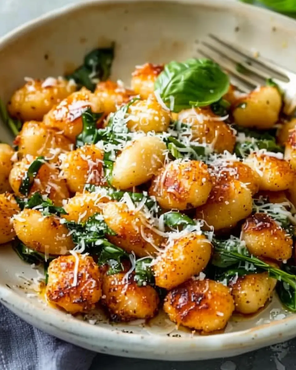 - Add the crispy gnocchi back into the skillet with the garlic and spinach. Toss everything gently, allowing the flavors to meld.