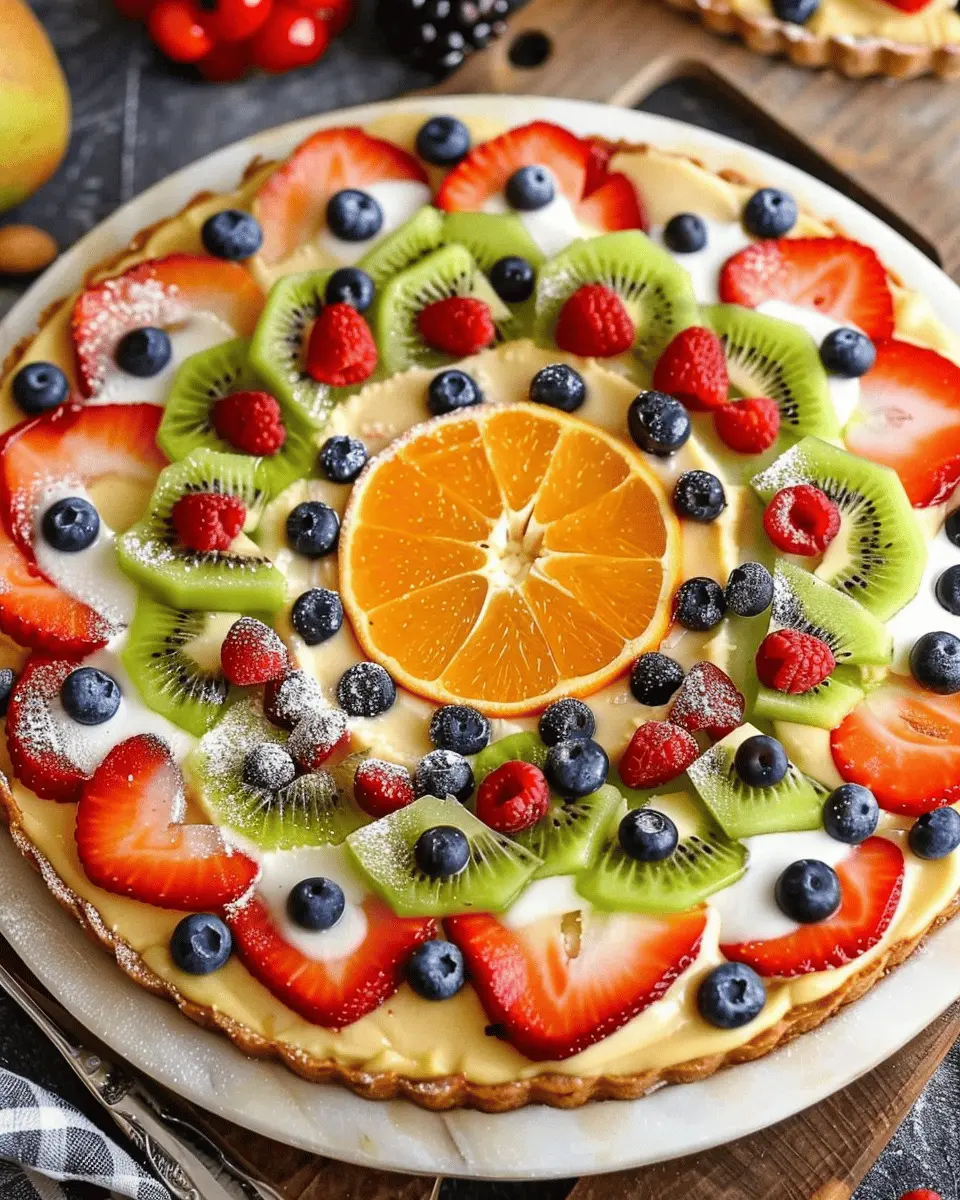 A delightful dessert that combines a cookie crust with a colorful array of fresh fruit and a sweet cream cheese topping.