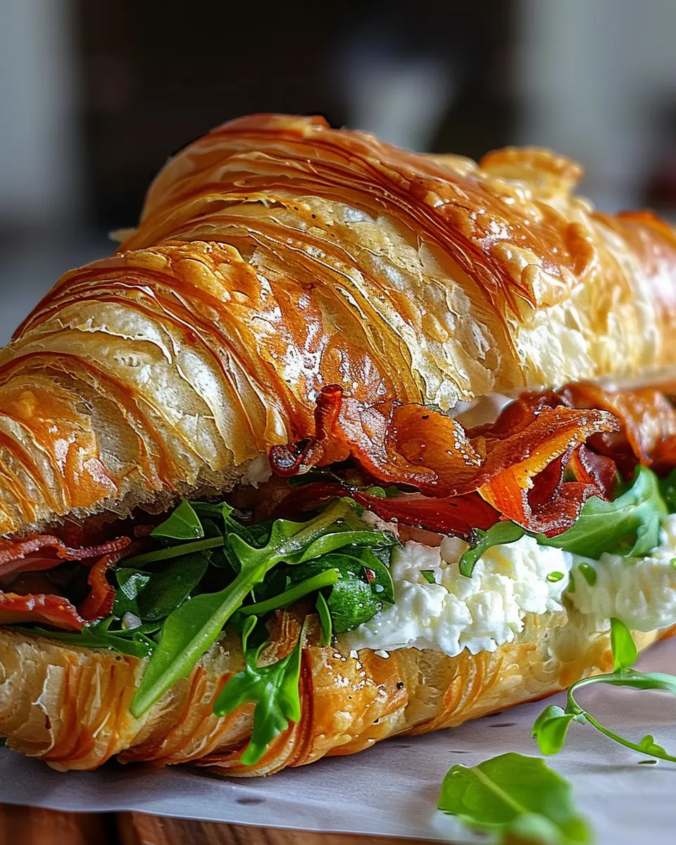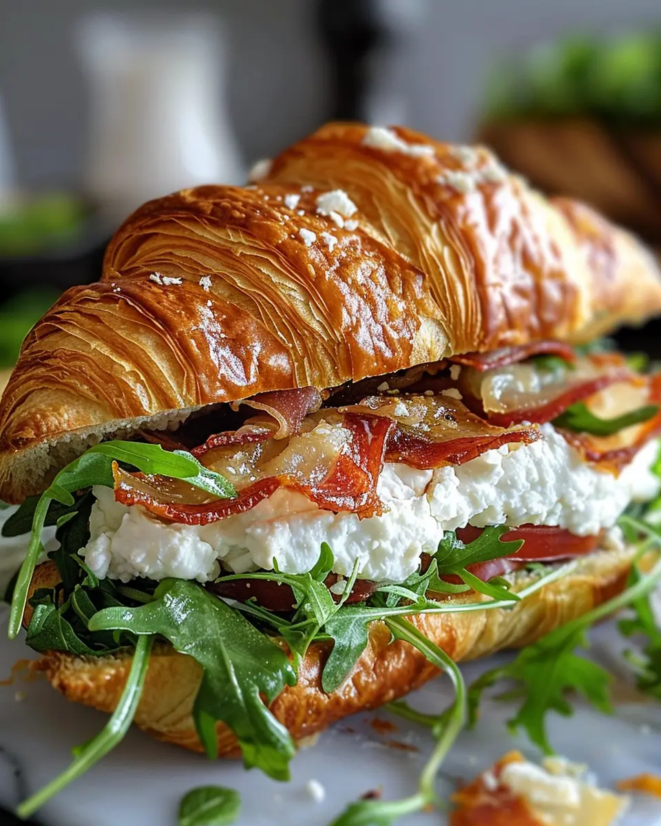 With all the components ready, it’s time to bring everything together. Start by spreading a generous layer of the goat cheese mixture on the bottom half of the croissant. Then, add your choice of protein—crispy turkey bacon or savory chicken ham—followed by a handful of arugula. If you’re adding extras like tomatoes or avocado, layer them on now. Finish with the top half of the croissant, pressing gently to secure all those delightful fillings in place.