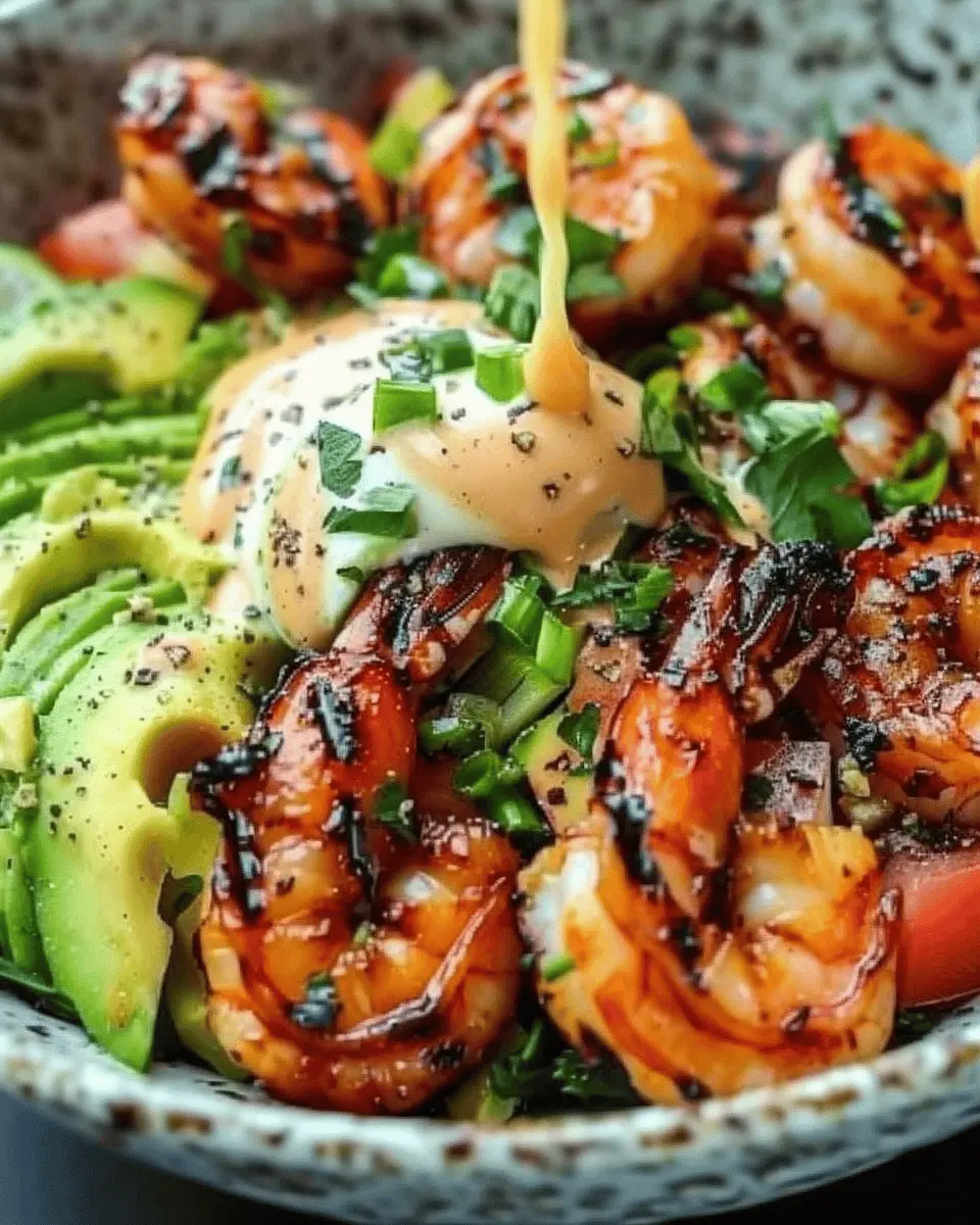 The final step: crafting your beautiful grilled shrimp bowl with avocado. Start with a base of your choice—brown rice, quinoa, or a fresh salad. Layer on your grilled shrimp, followed by slices of creamy avocado, a generous spoonful of corn salsa, and a drizzle of your creamy garlic sauce.