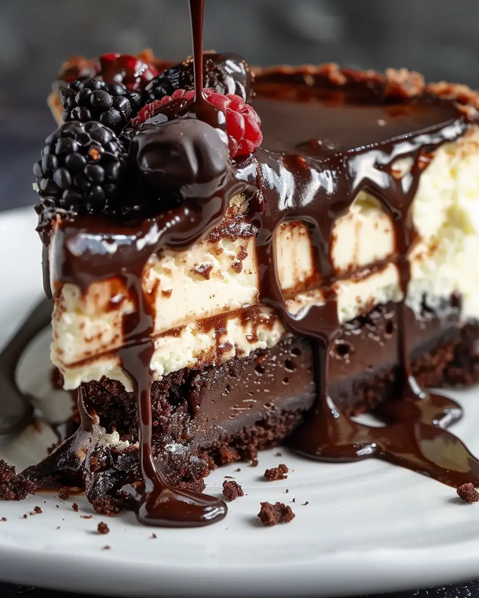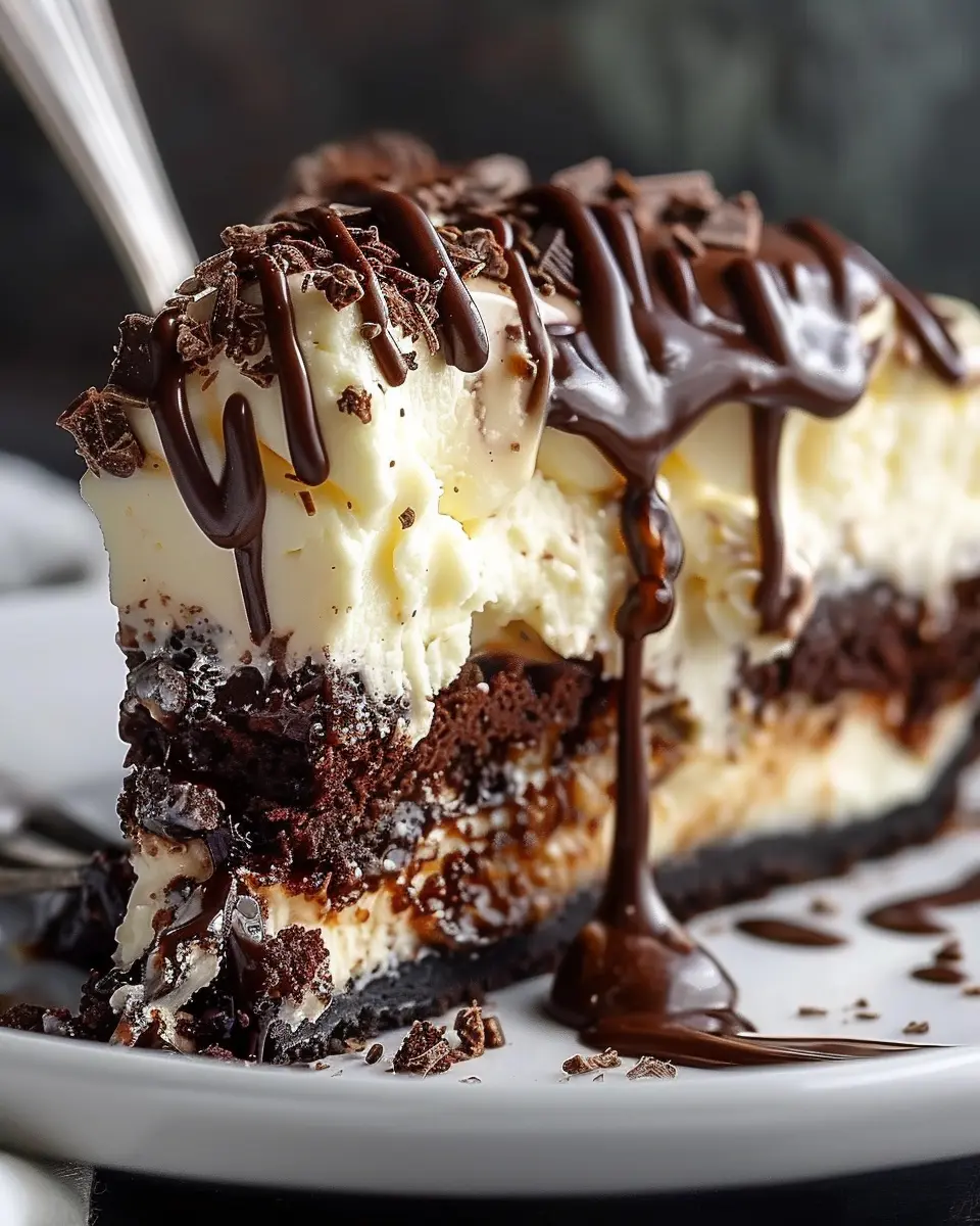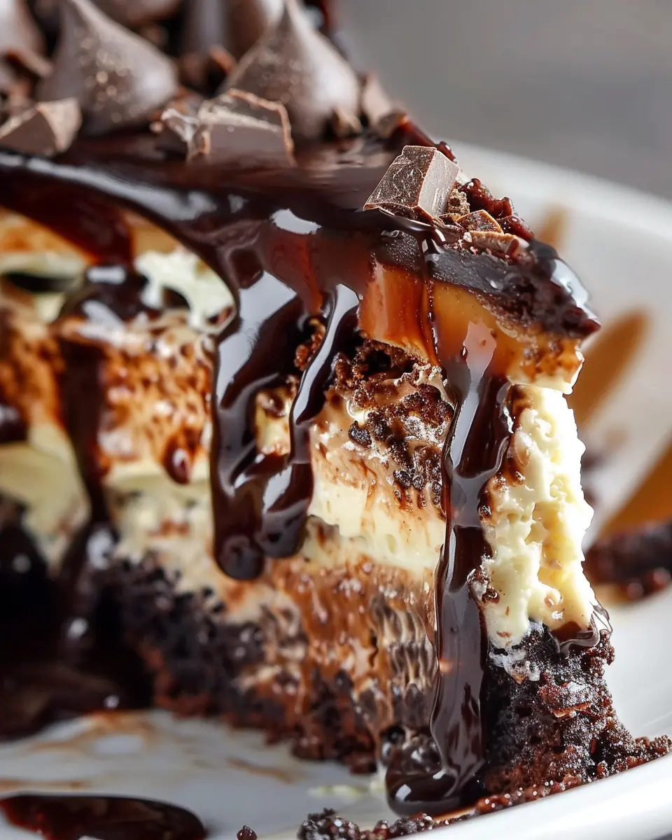 A decadent dessert that combines brownies, cheesecake, and hot fudge for an indulgent treat.