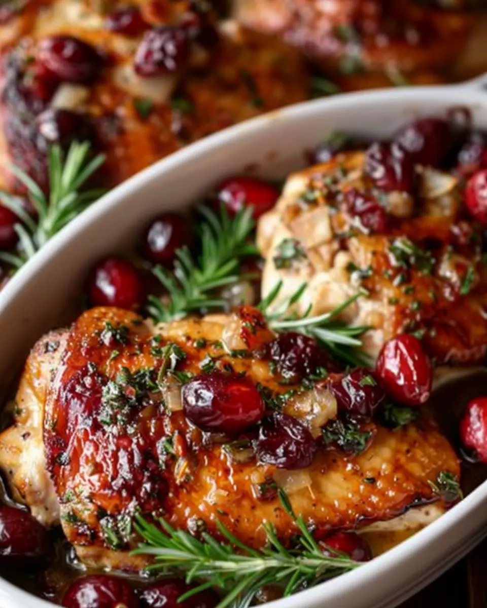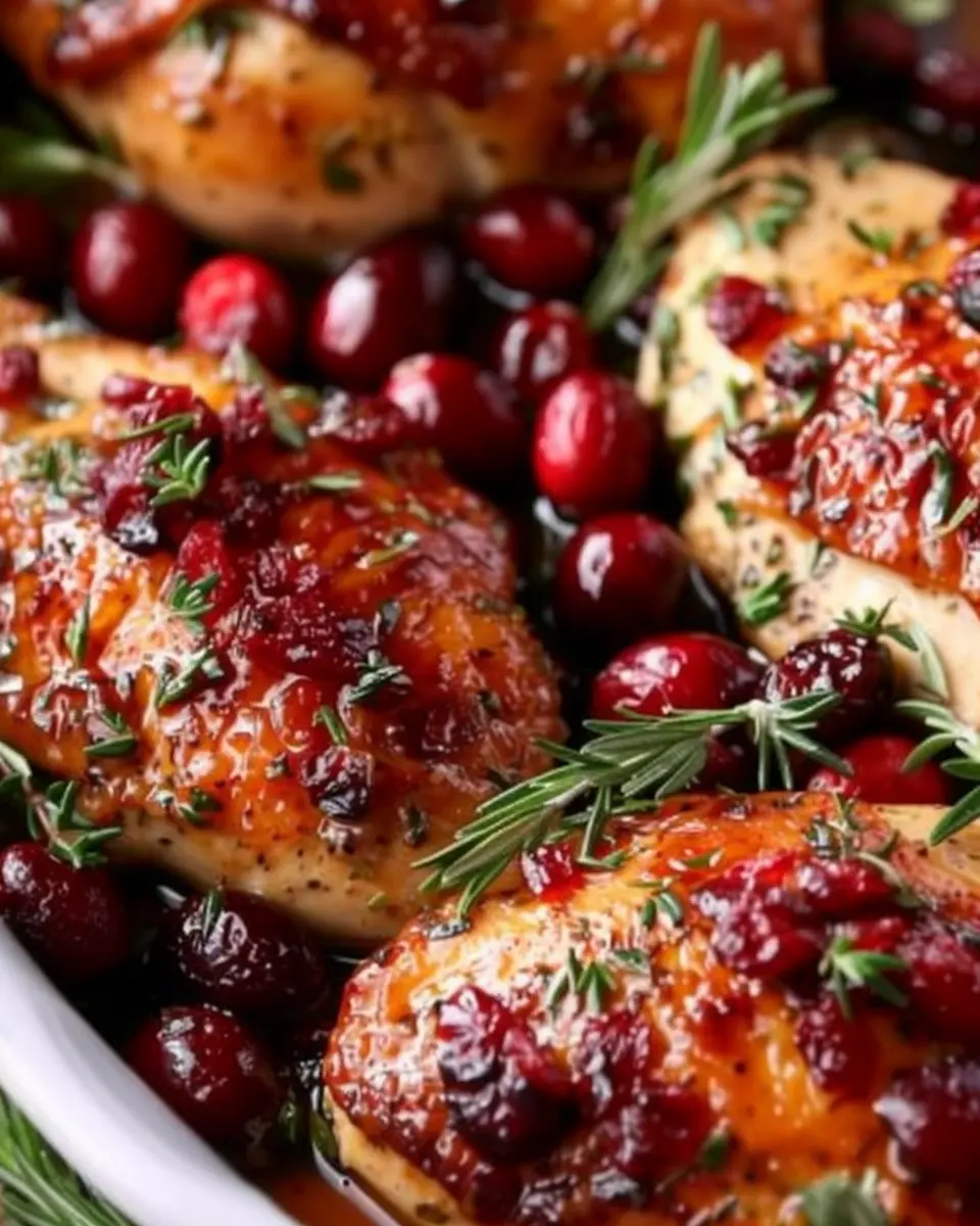 - Place chicken breasts in a baking dish and pour the cranberry mixture over them.