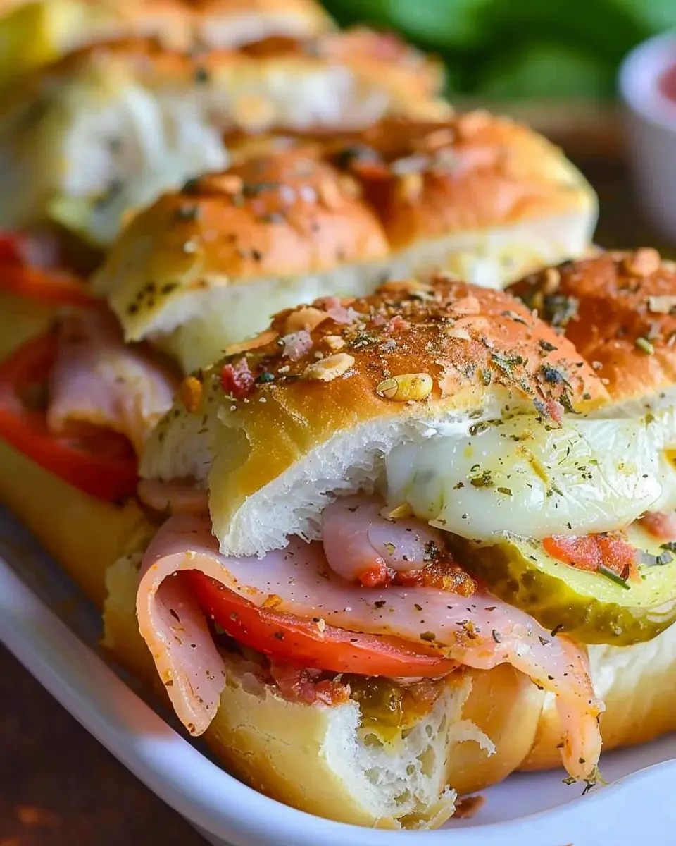 Delight in these Hot Italian Sub Sliders loaded with savory turkey bacon and chicken ham.