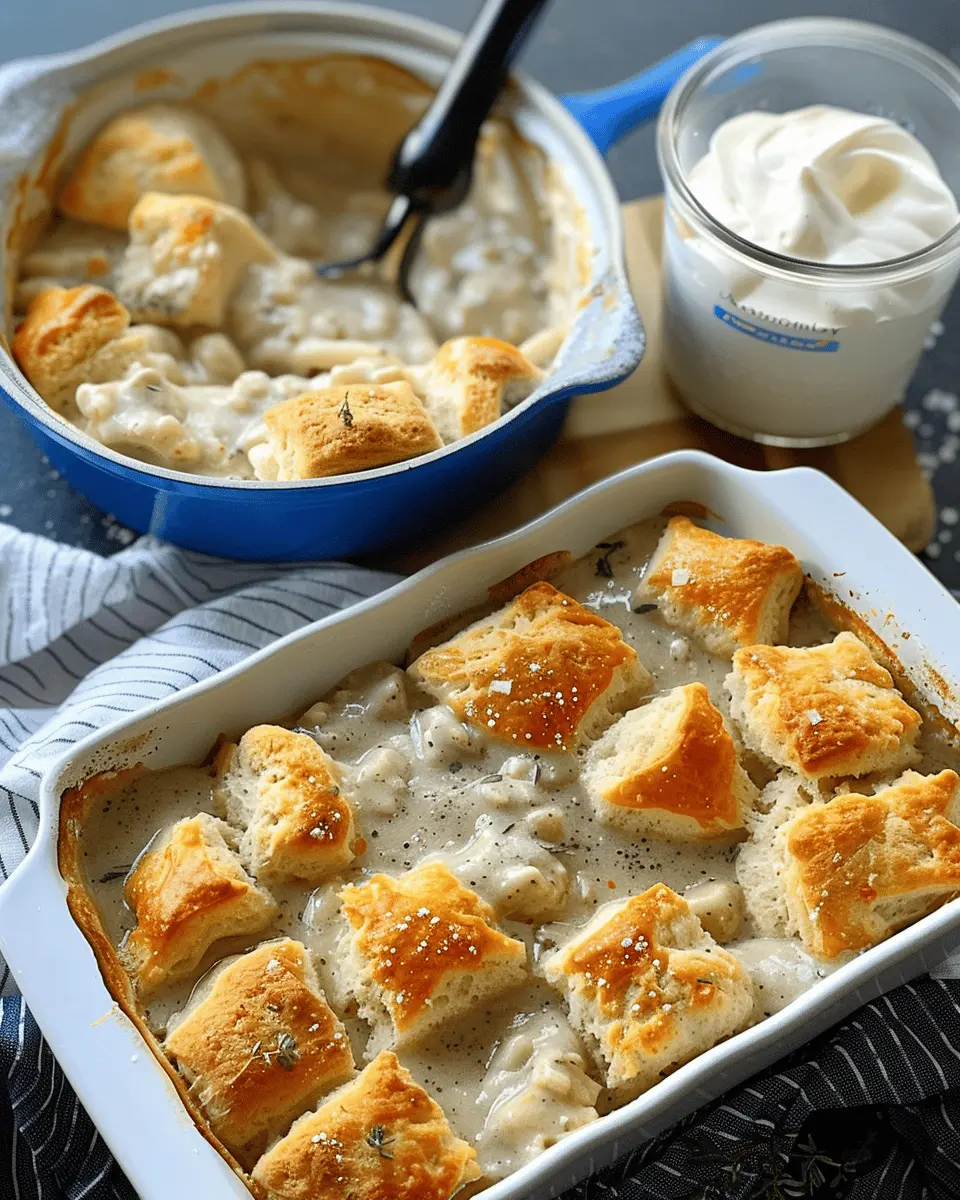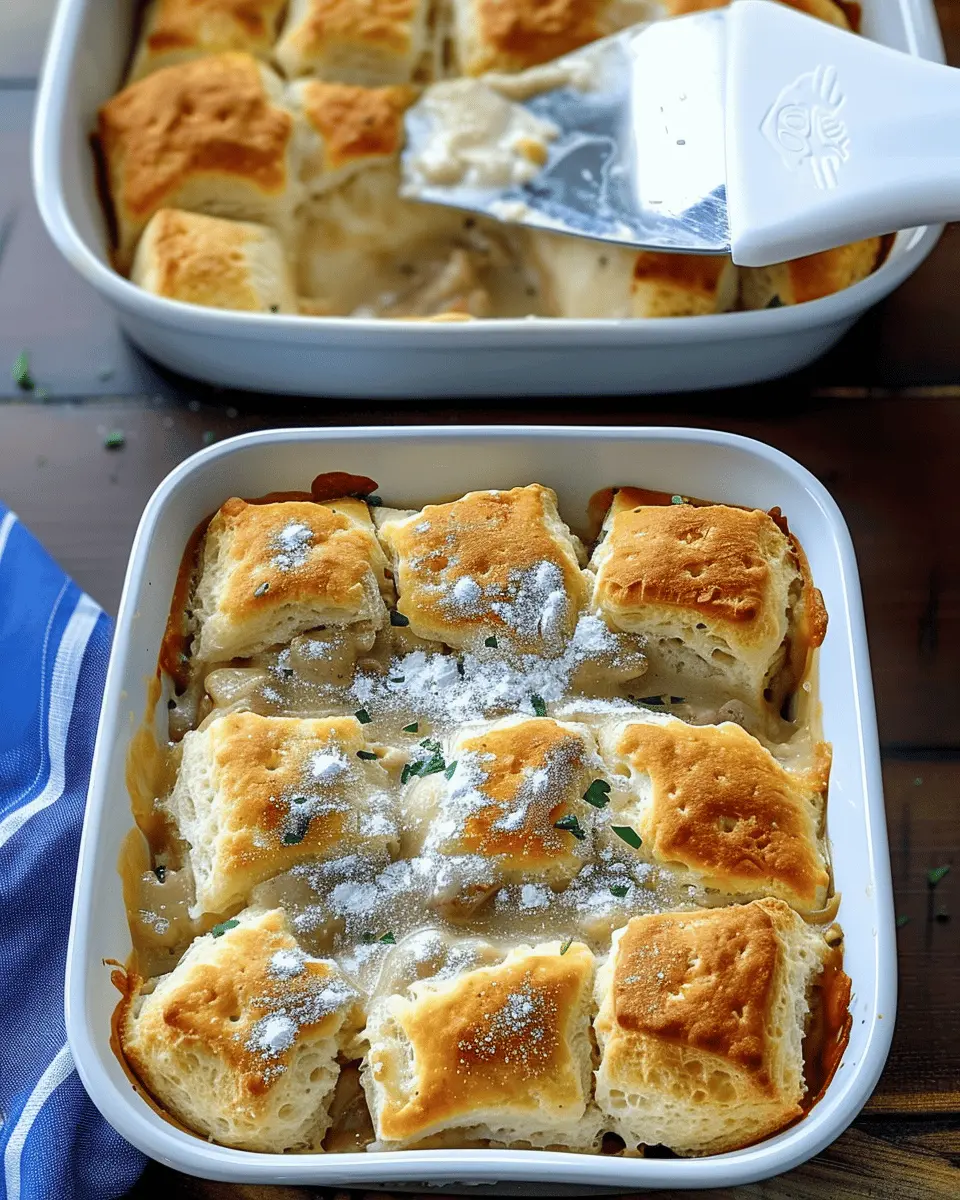 Finally, pop your casserole in the oven and let it bake for about 25–30 minutes. You’ll know it’s ready when the biscuits are golden brown and the gravy is bubbling. The smell wafting from your oven will be irresistible!