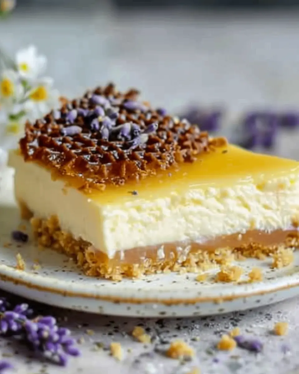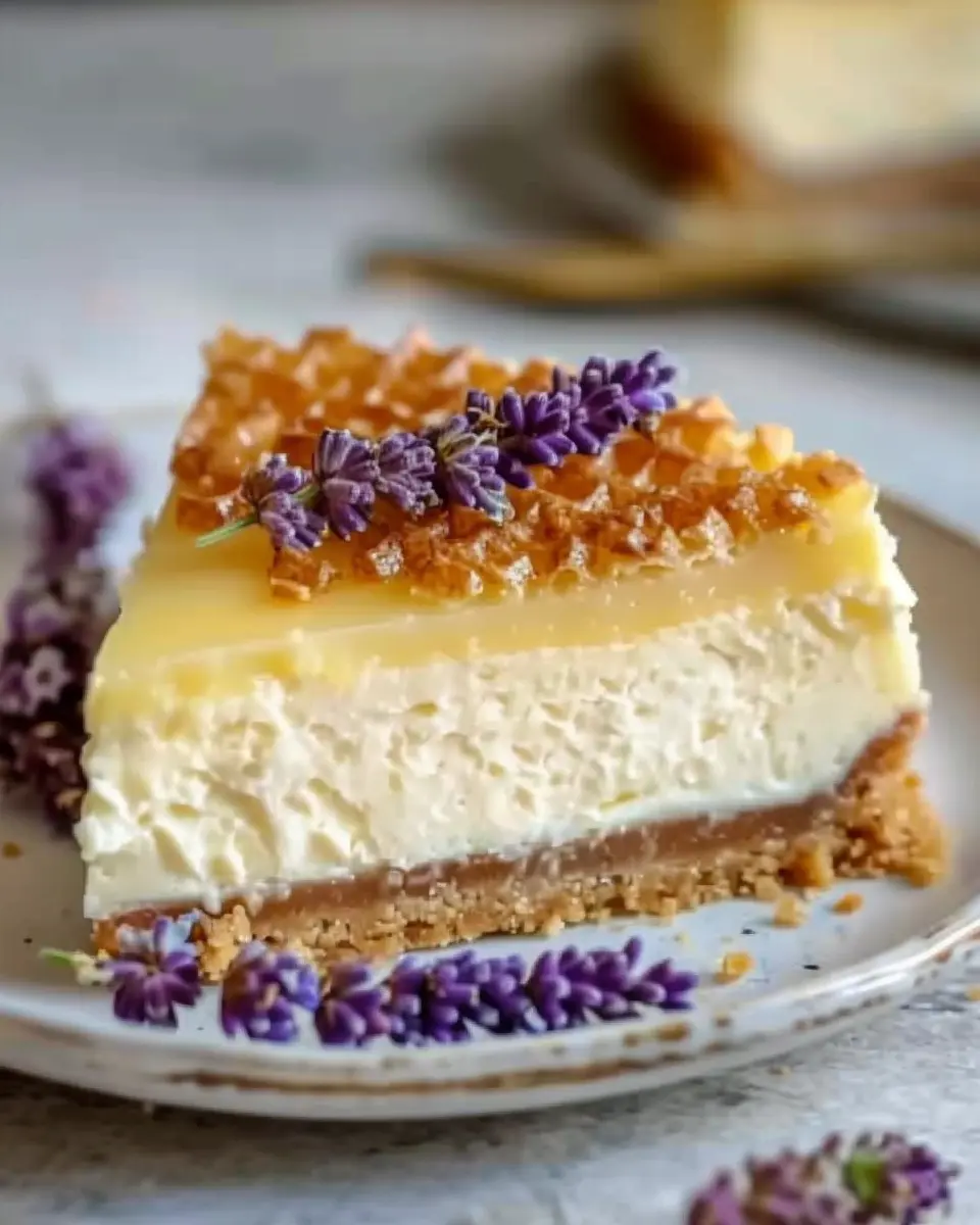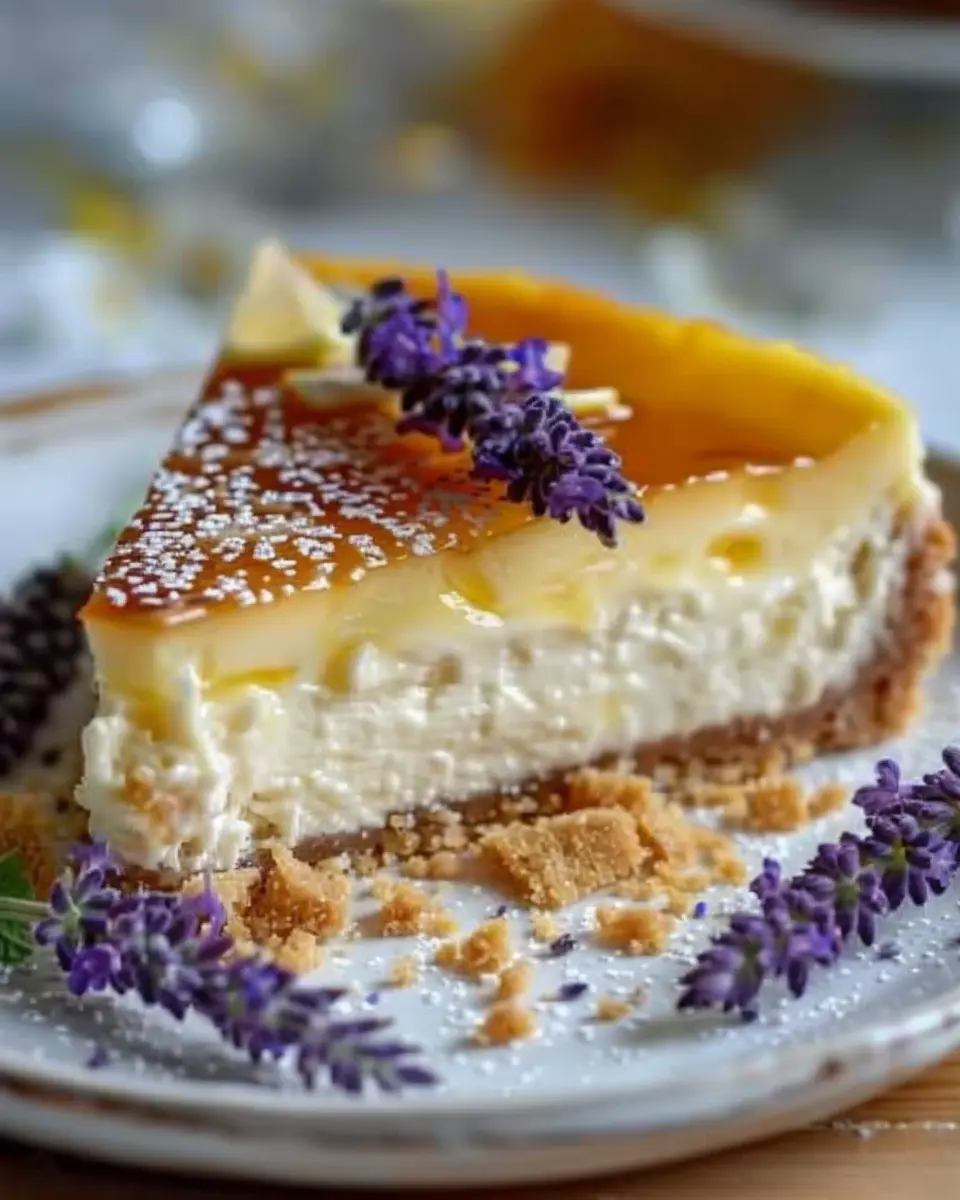 A delightful cheesecake infused with the refreshing flavors of lemon and lavender, perfect for dessert lovers.