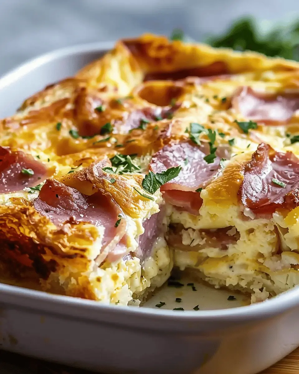 PrintMonte Cristo Breakfast Casserole: Easy Indulgence with Turkey Bacon and Chicken Ham