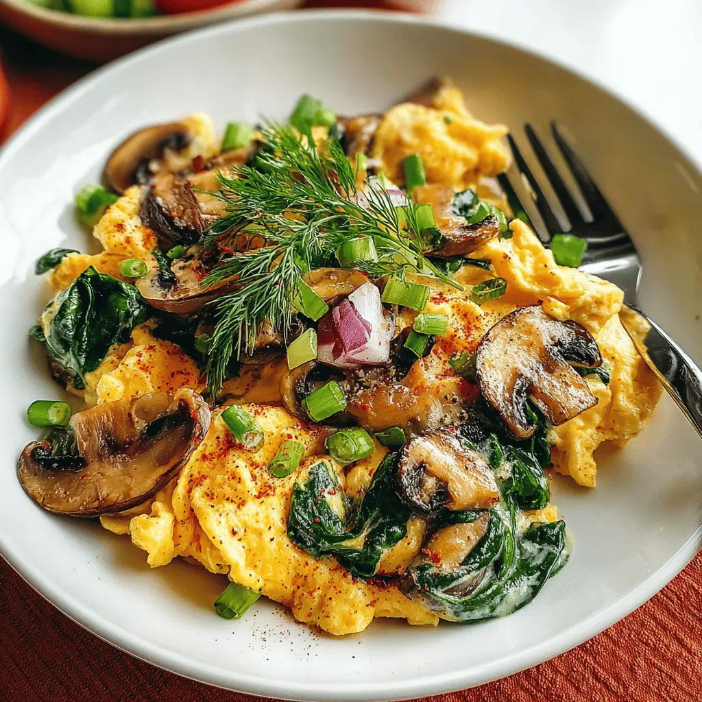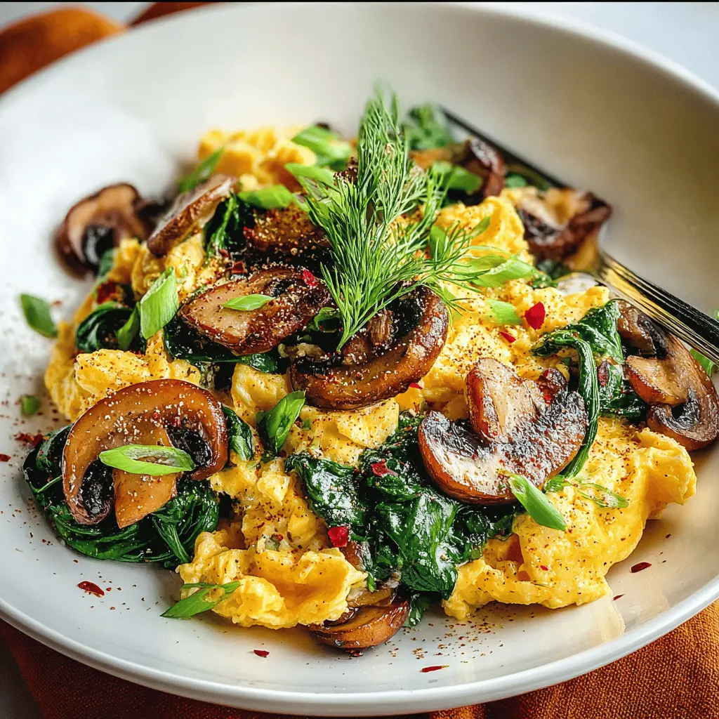 PrintMushroom-Spinach Scrambled Eggs: A Healthy & Easy Breakfast Delight