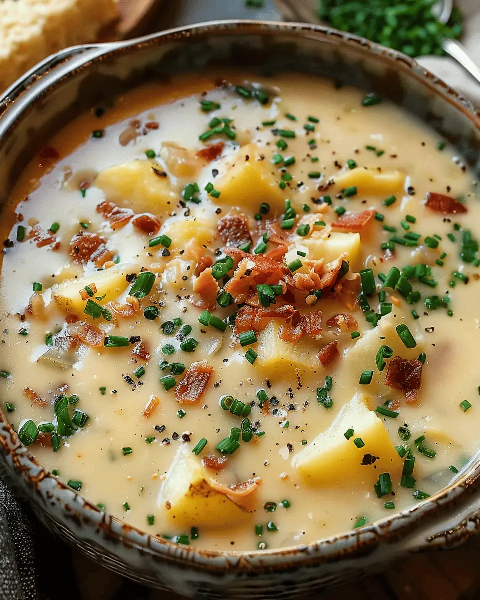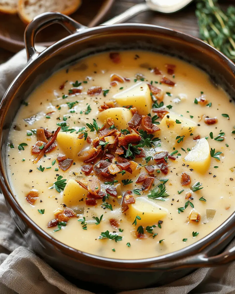 A creamy and hearty potato soup featuring turkey bacon for a comforting meal.