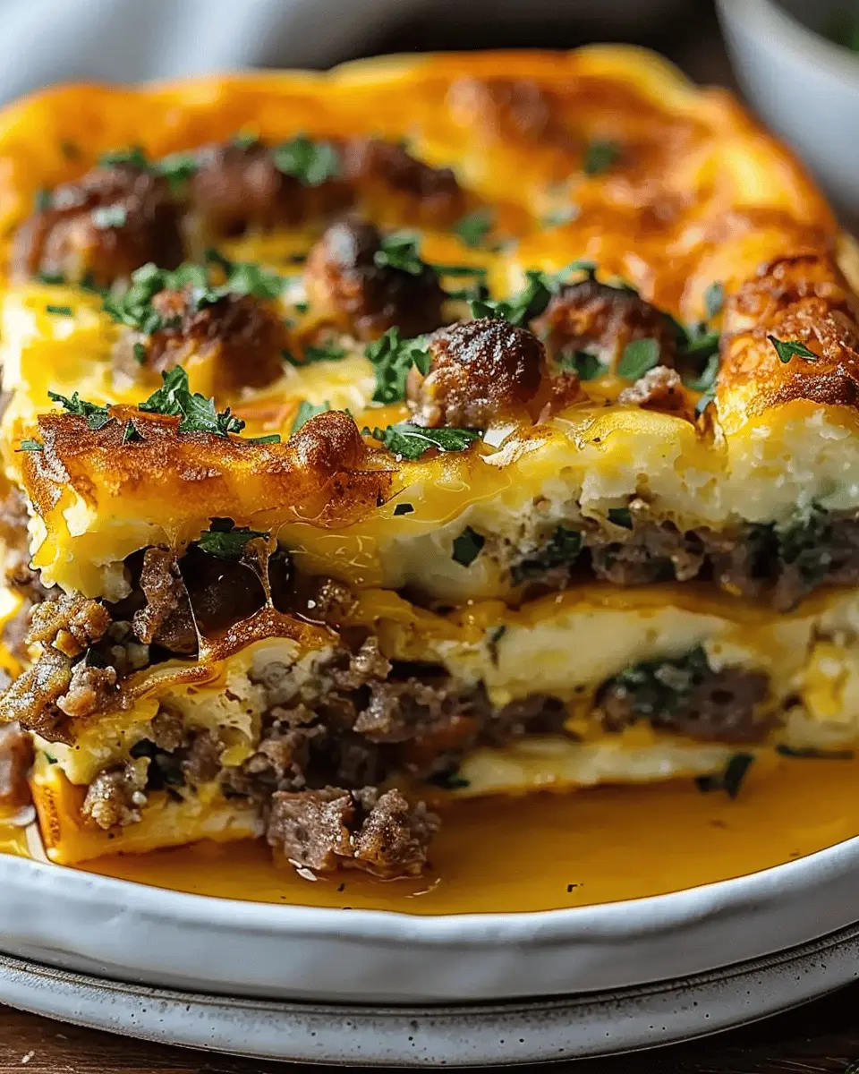 Now it’s time to bring it all together. Preheat your oven to 350°F (175°C) while you prepare a greased baking dish. Pour a third of the batter into the dish to create a base layer. Next, sprinkle the cooked beef sausage evenly over the batter, followed by another third of the batter on top. Finally, pour the remaining batter on top of everything, creating a lovely layered effect. This is what makes the Pancake Sausage Breakfast Bake so enticing—each layer blends flavors beautifully as it bakes.