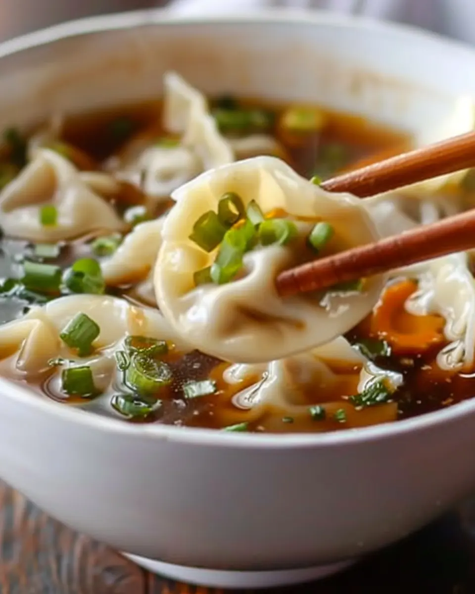 Enjoy a warm bowl of Potsticker Soup, featuring savory turkey bacon and chicken ham, perfect for cozy evenings.