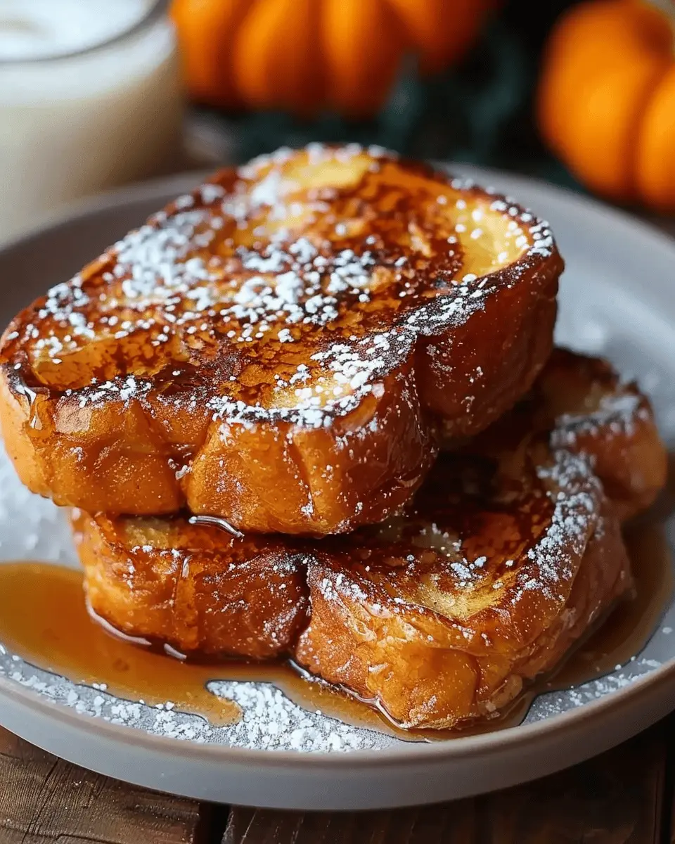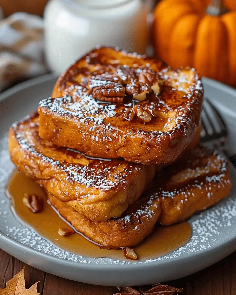 Once all your slices are perfectly cooked, it’s time for the fun part—plating! Serve your Pumpkin French Toast warm, dust with powdered sugar, and drizzle with maple syrup. For added flair, top it with whipped cream, nuts, or even some fresh fruit.