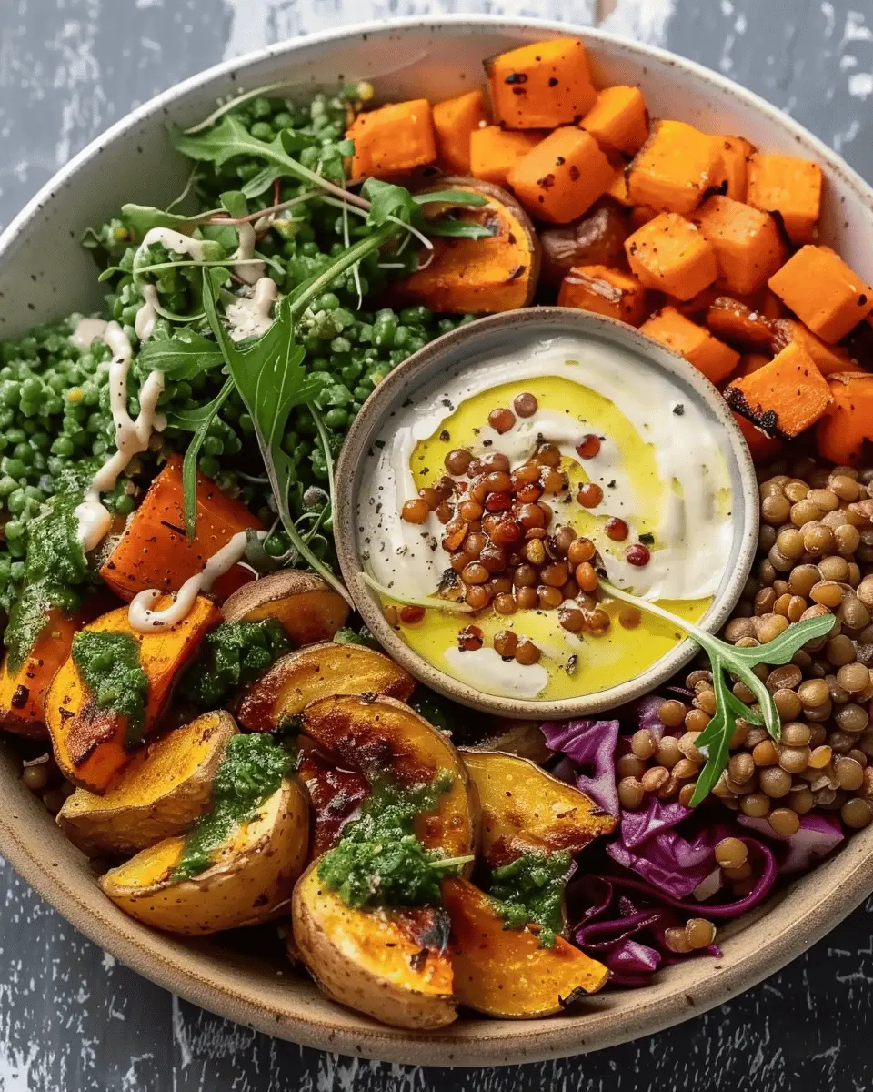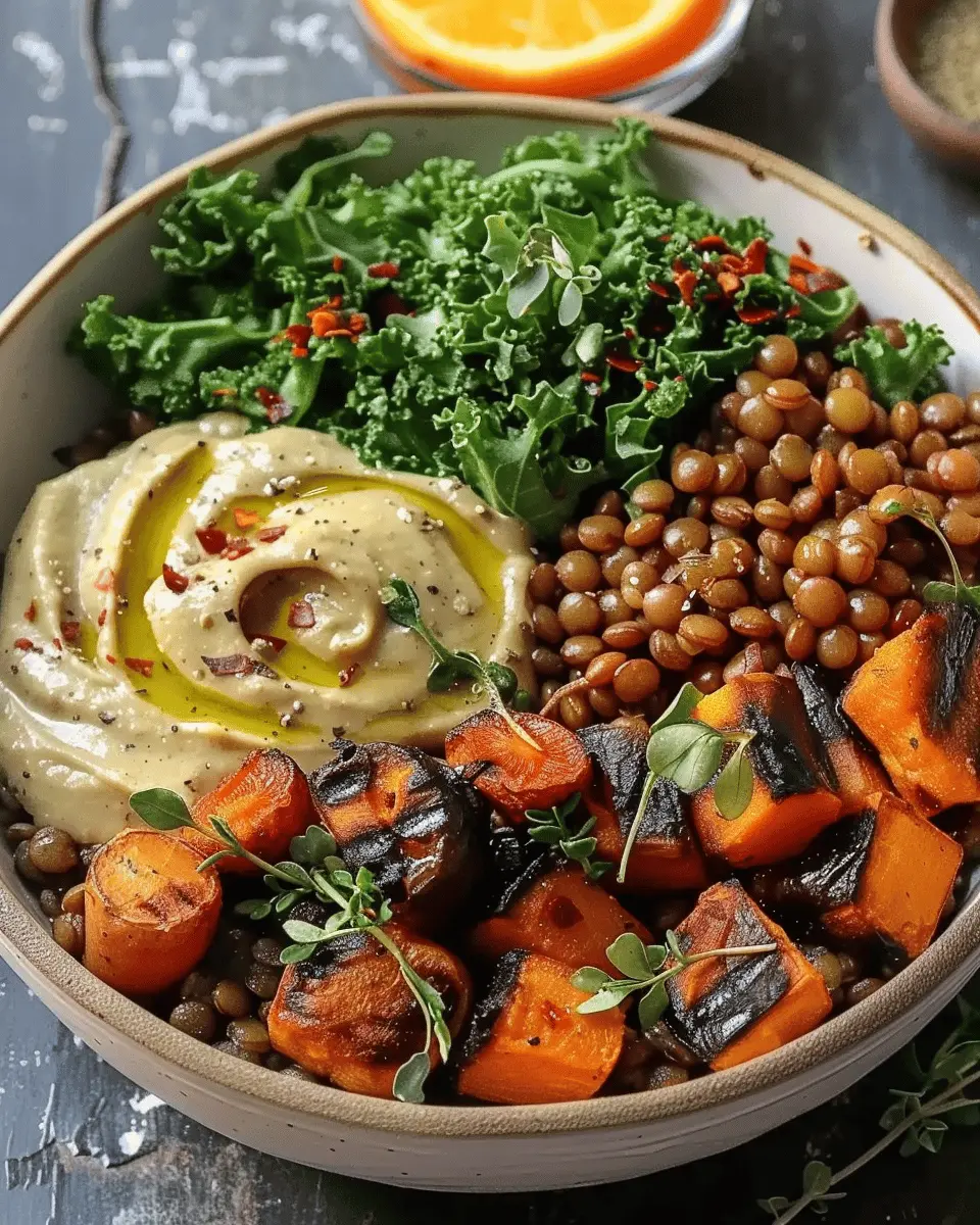 A delicious and wholesome roasted veggie lentil bowl that combines healthy ingredients for a comforting meal.