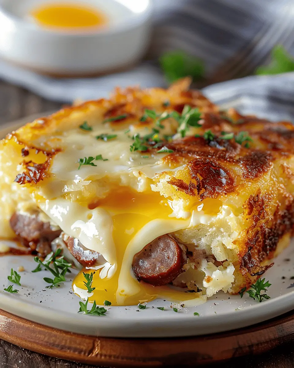 A delicious and comforting dish featuring sausage, eggs, and cream cheese over crispy hashbrowns.