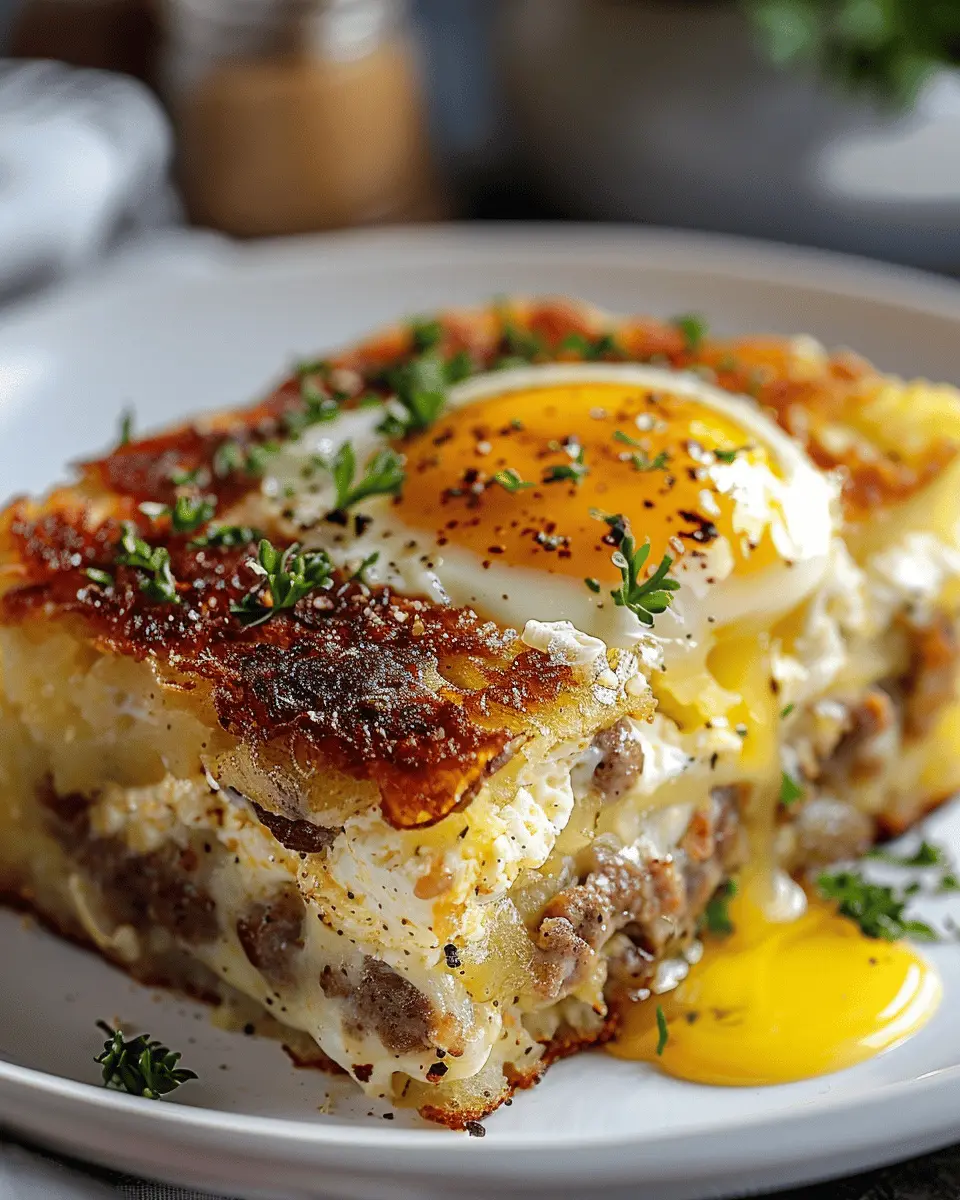 Enjoy a hearty and comforting meal with Sausage, Egg, and Cream Cheese Hashbrown, perfect for breakfast or brunch.