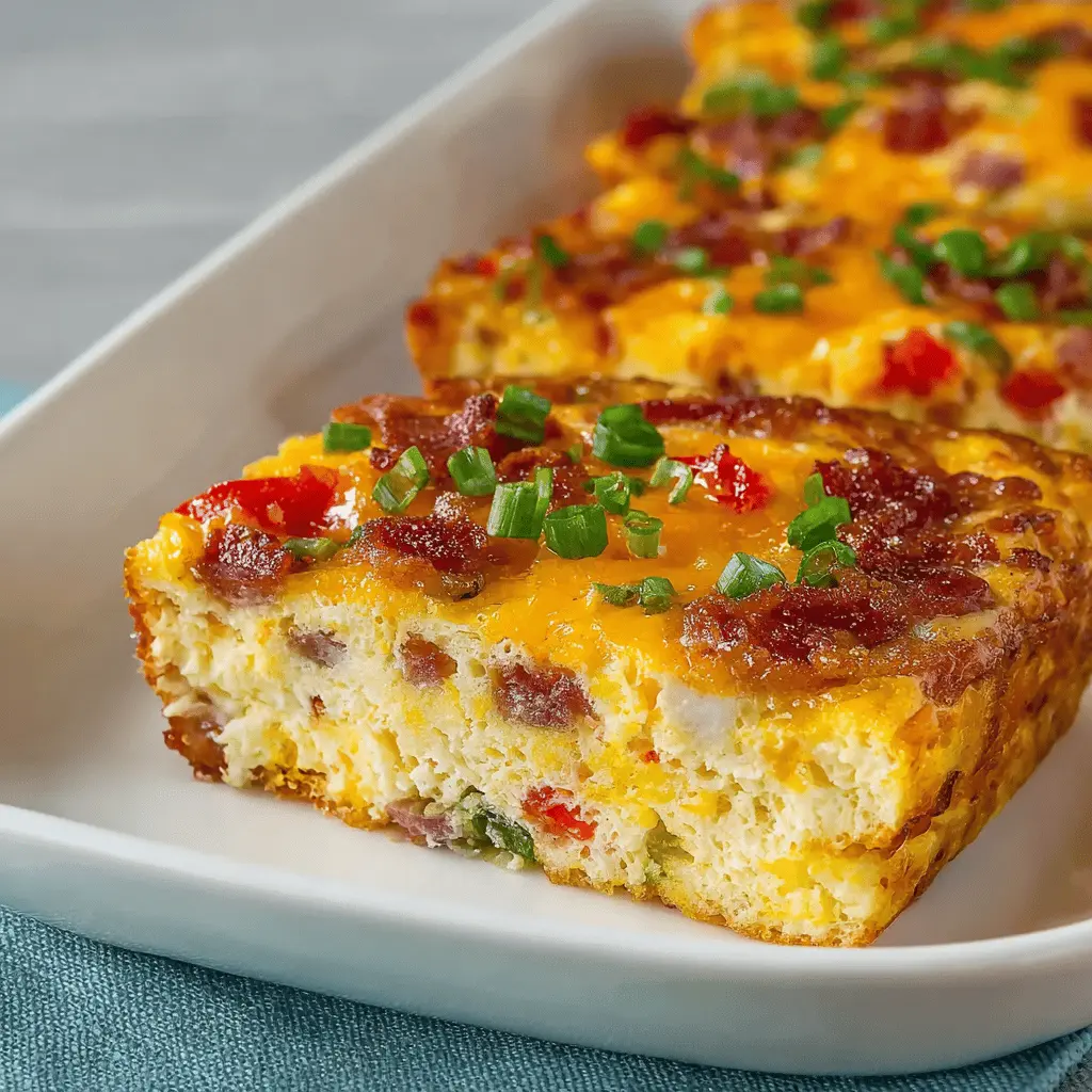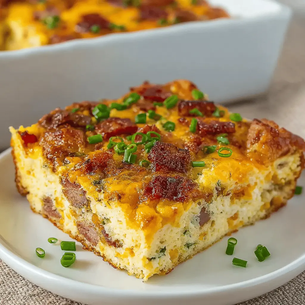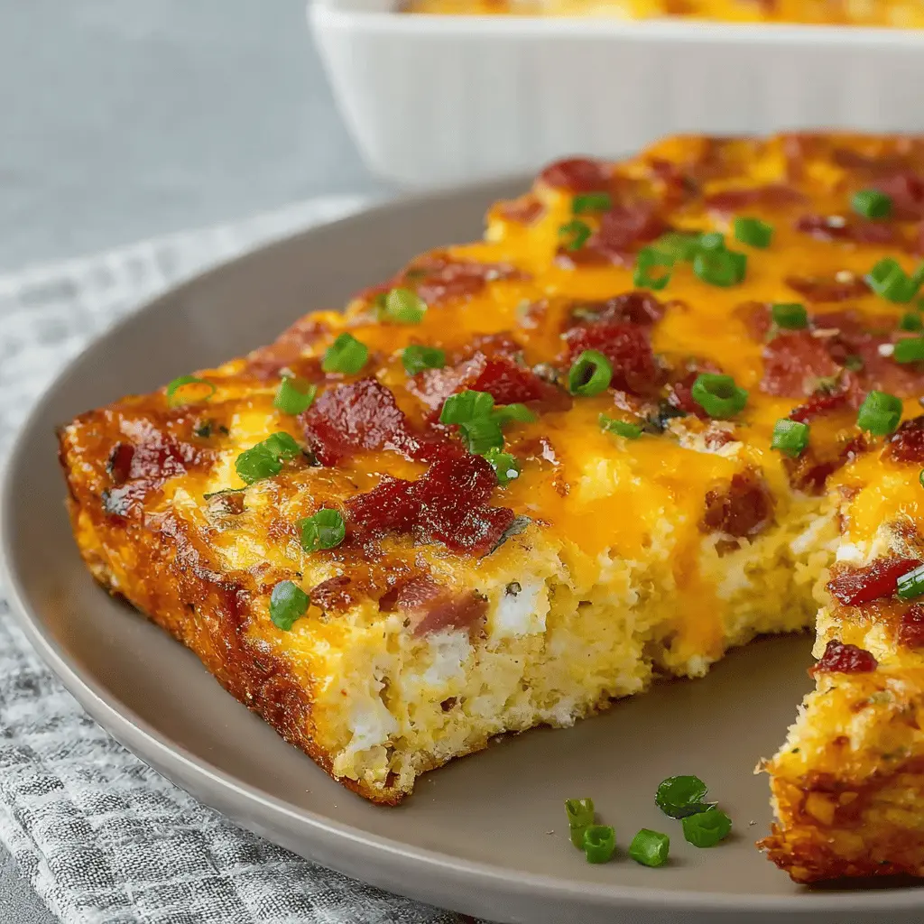A delicious breakfast casserole featuring cheese and turkey bacon, perfect for family gatherings.