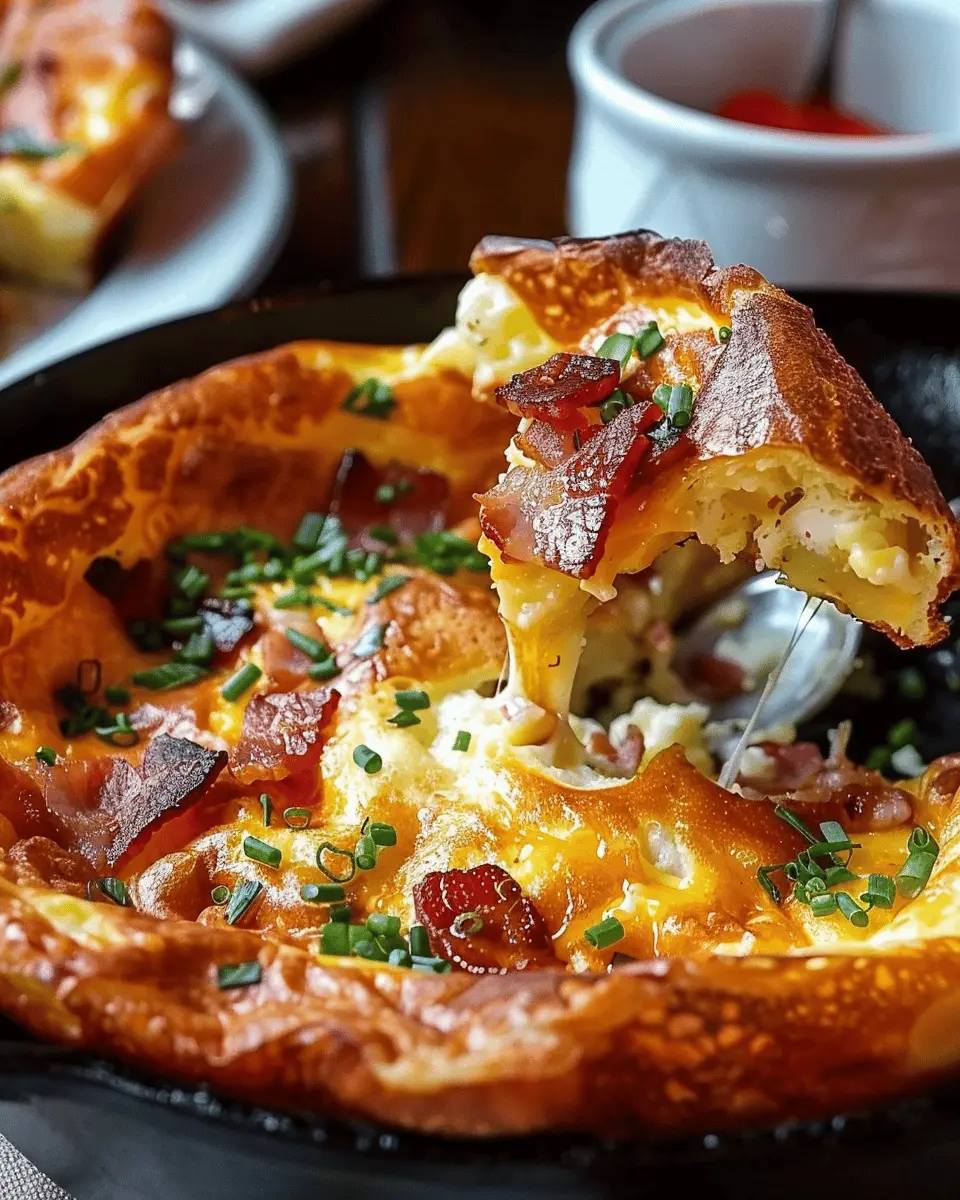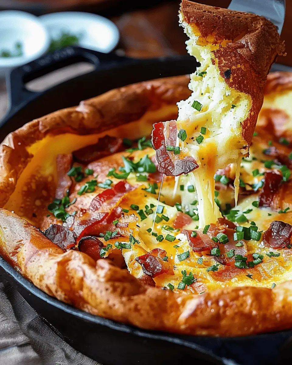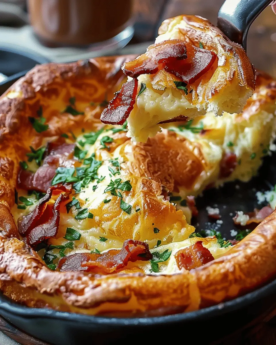A deliciously fluffy and savory Dutch baby, packed with cheddar cheese and crispy turkey bacon.
