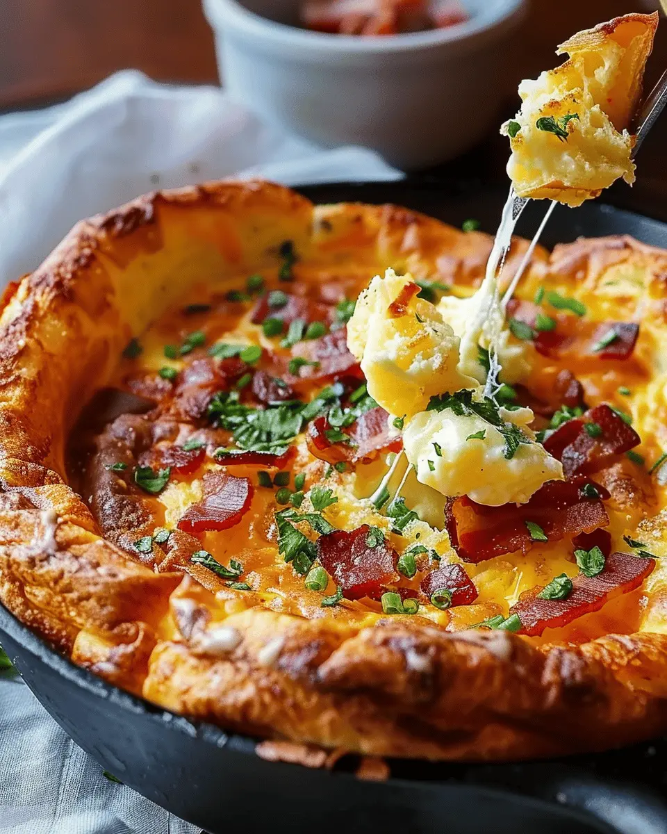 A delightful savory dish combining cheddar cheese and turkey bacon in a fluffy Dutch baby pancake.