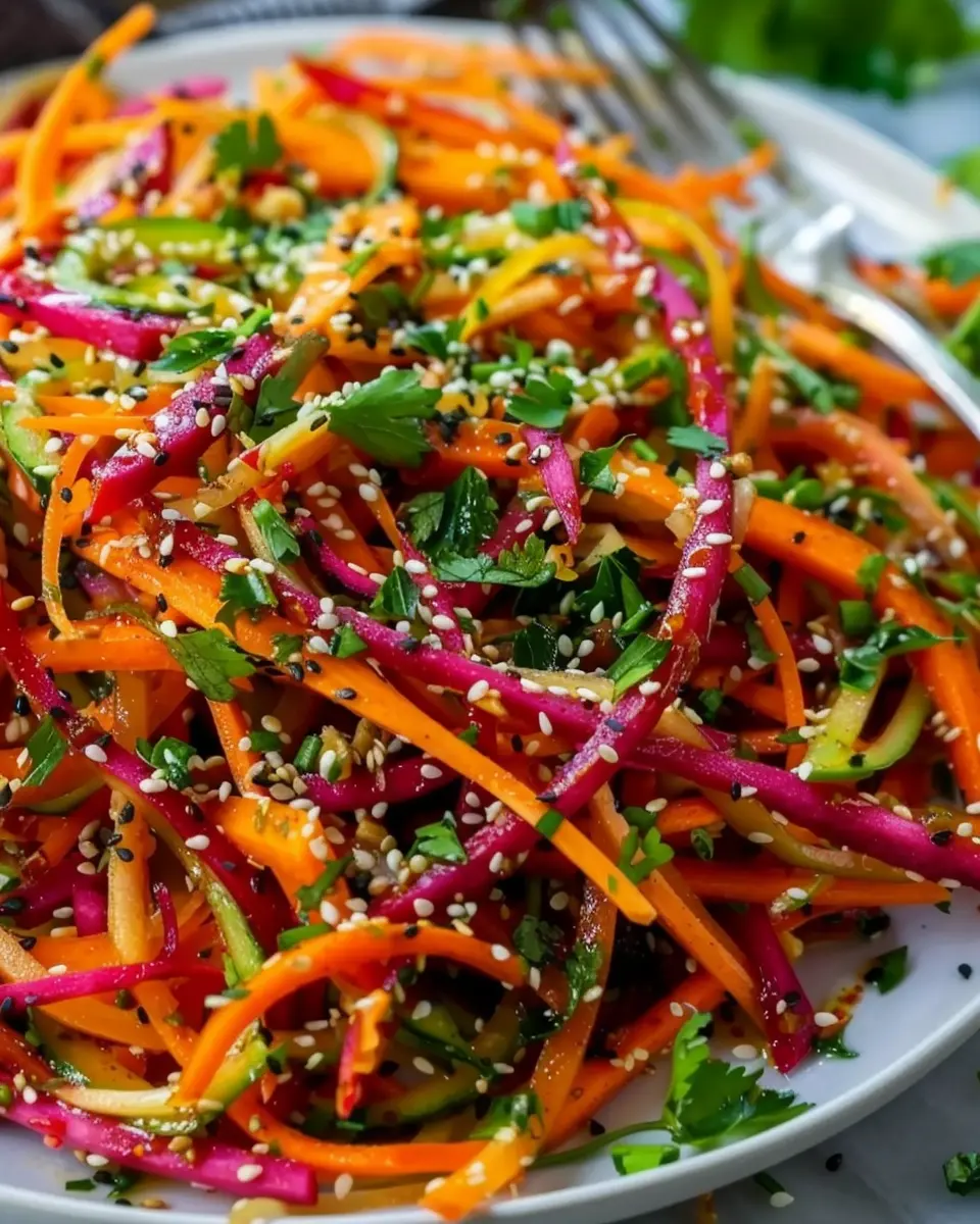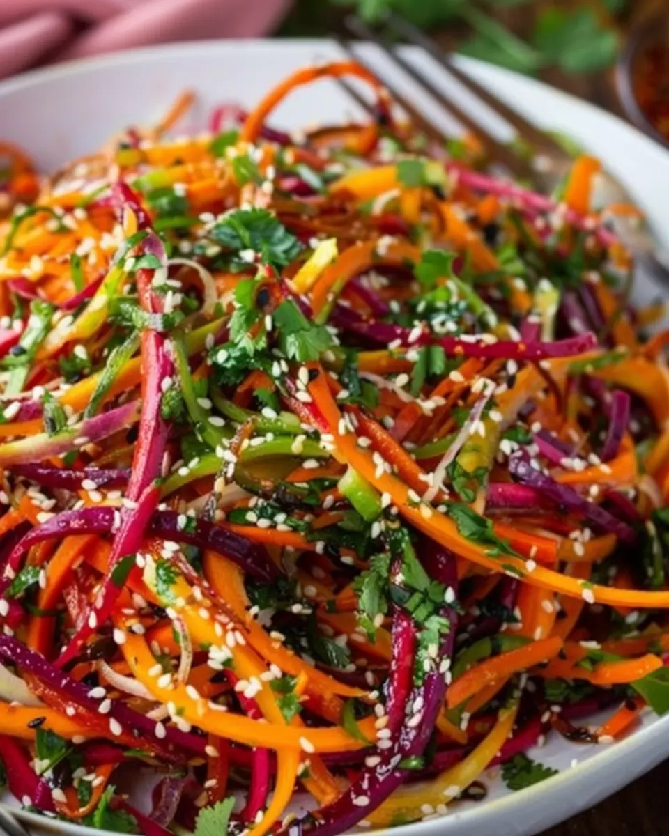 Absolutely! While shaved rainbow carrots give your salad a vibrant and colorful twist, regular orange carrots work just as well if that’s what you have on hand. The key to this salad is the crisp texture and the nutty sesame dressing, so feel free to substitute with whatever carrots you prefer. If you’re looking for some extra color, you can always add in a few slices of purple cabbage or red bell pepper for that pop!