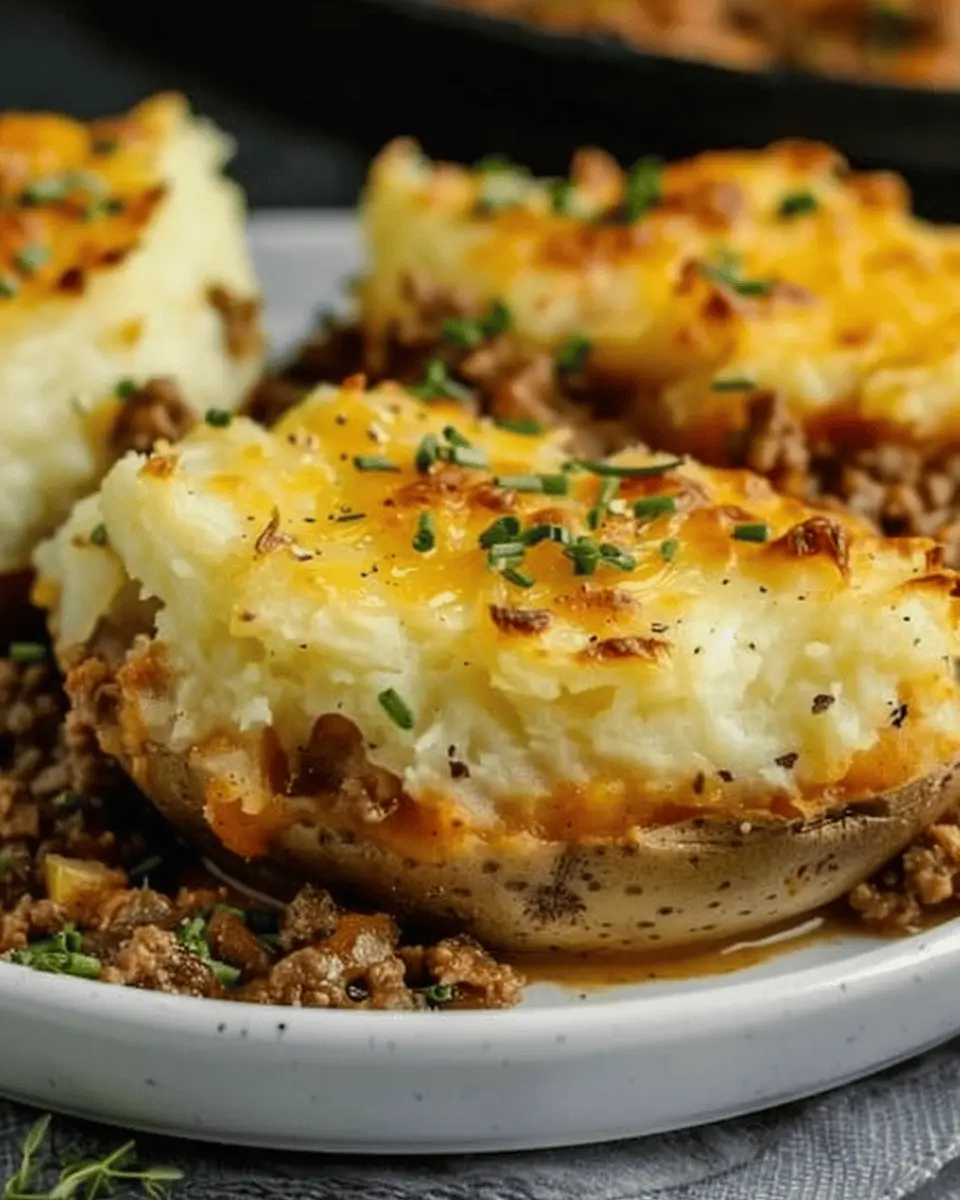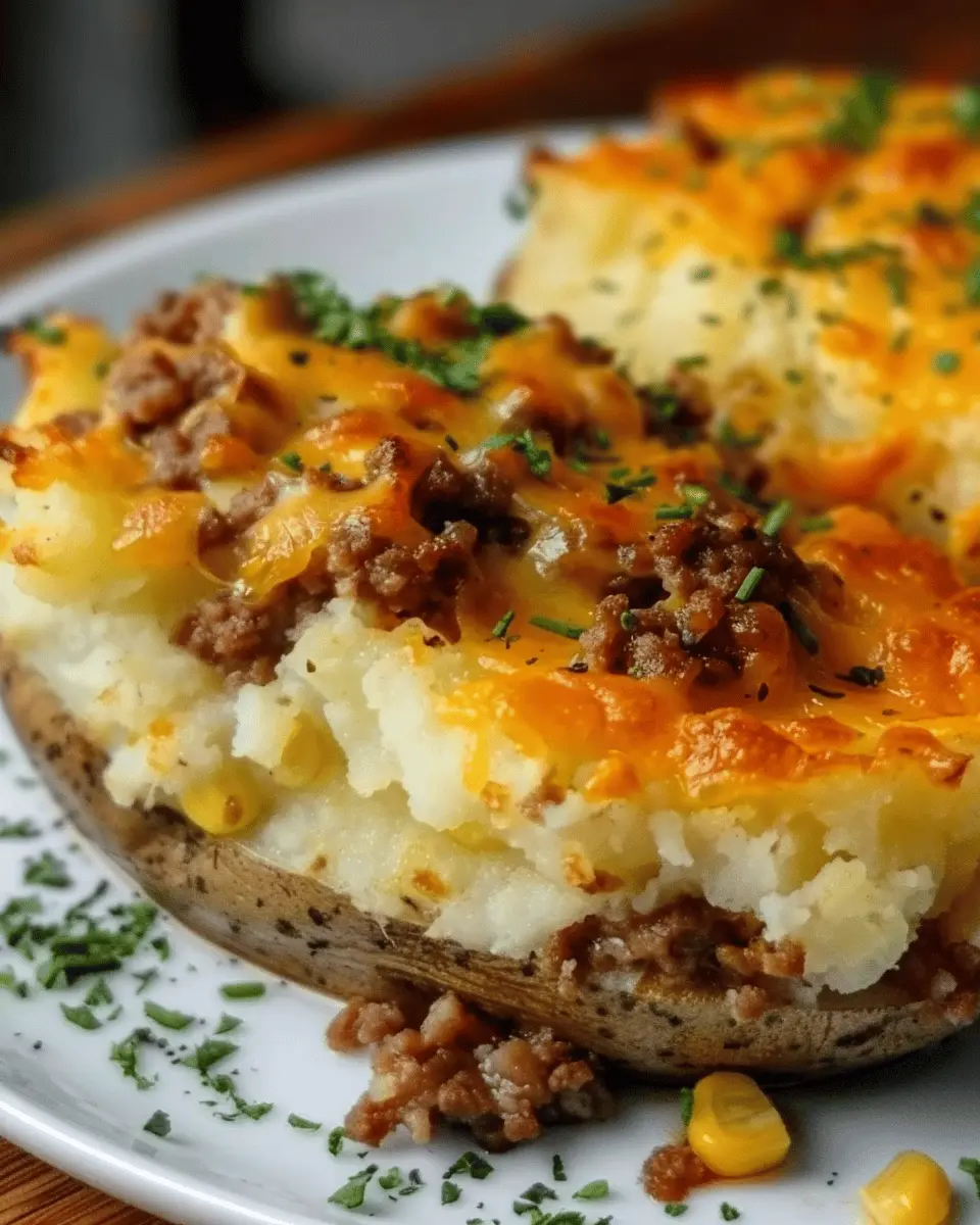 A delightful twist on traditional shepherd’s pie, using baked potatoes as the base.