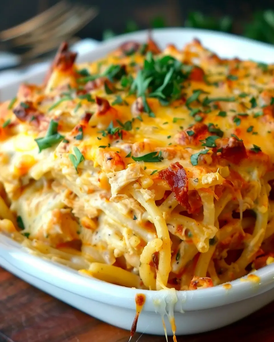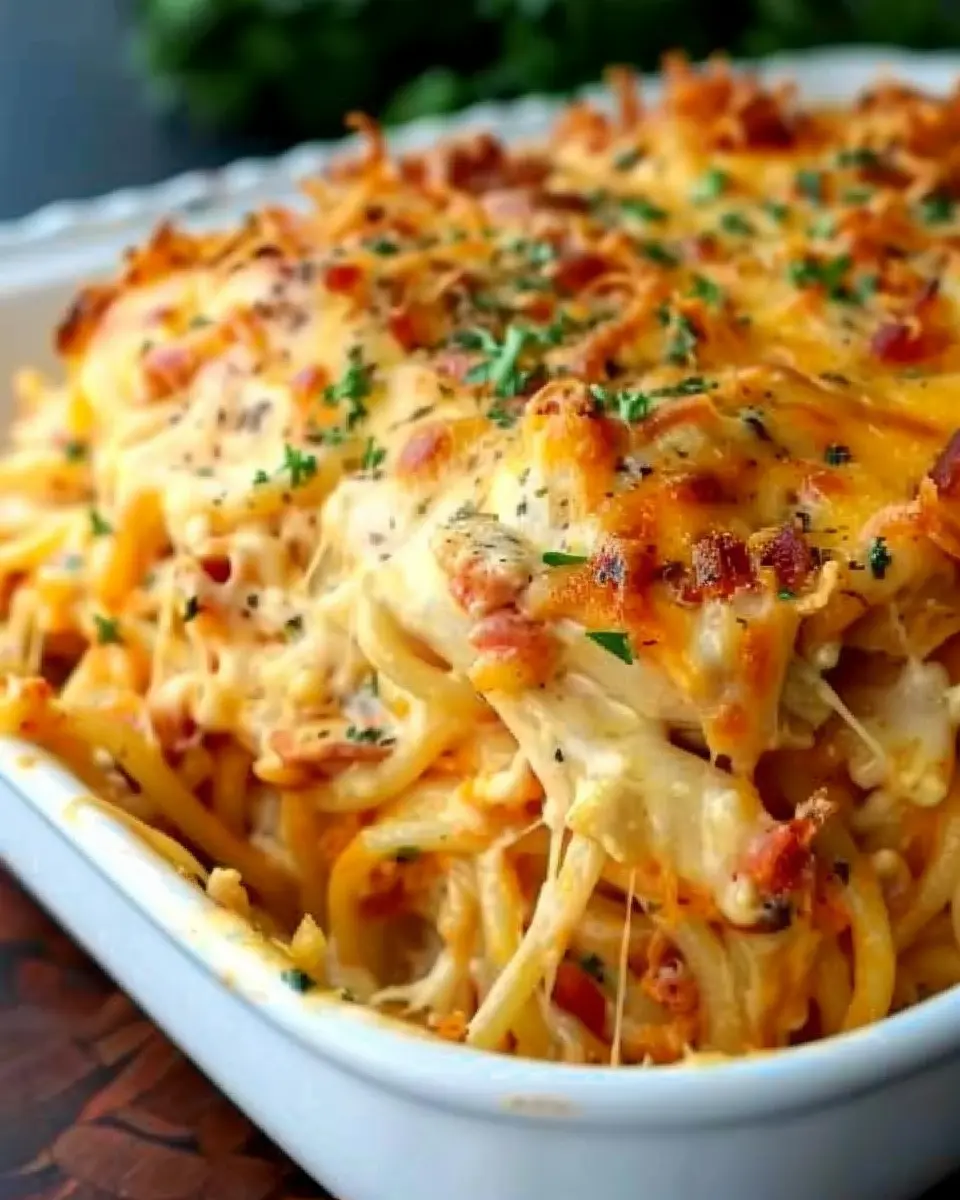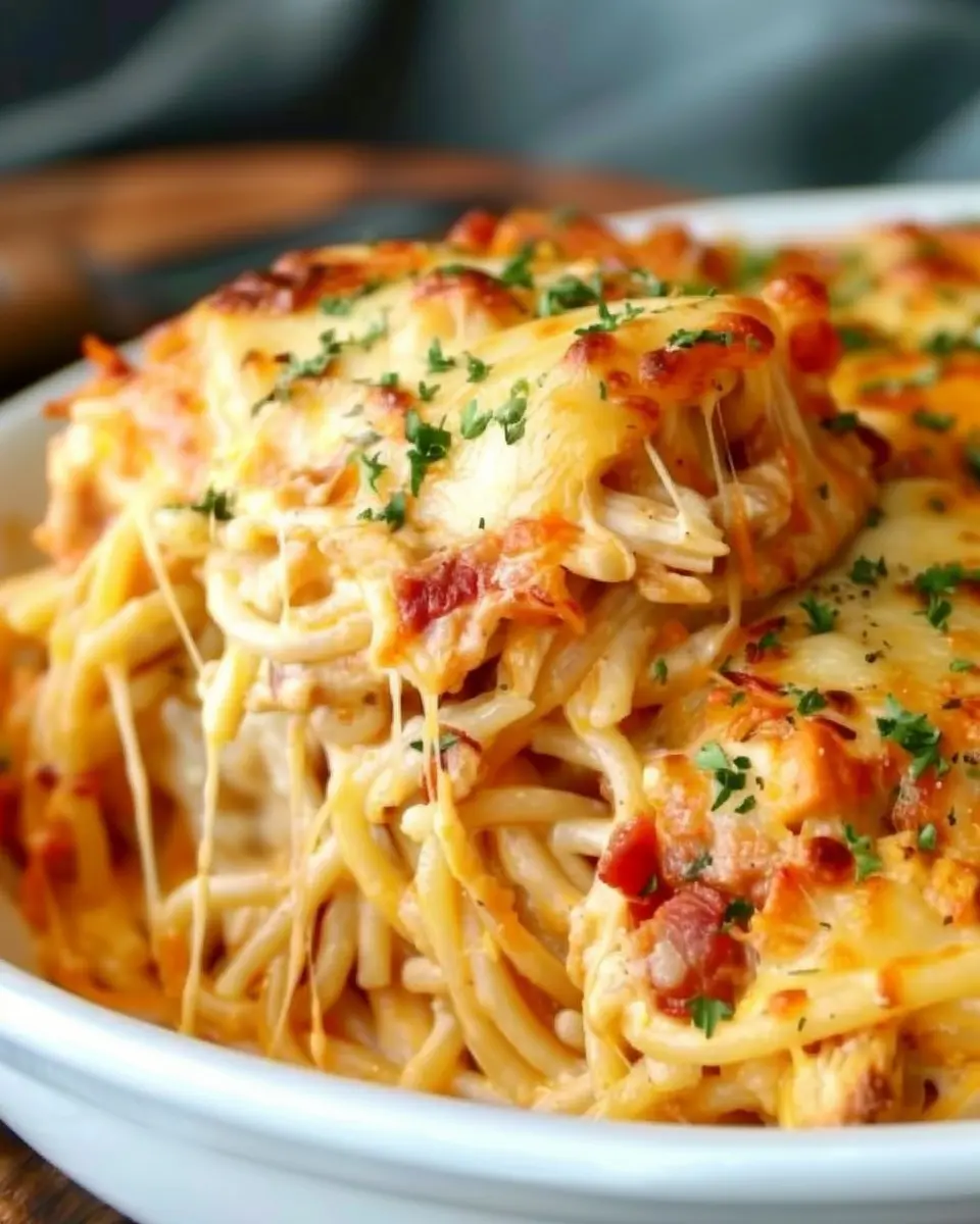 Spicy Southern Cheesy Chicken Spaghetti Casserole Delightfully Indulgent with Turkey Bacon and Chicken Ham