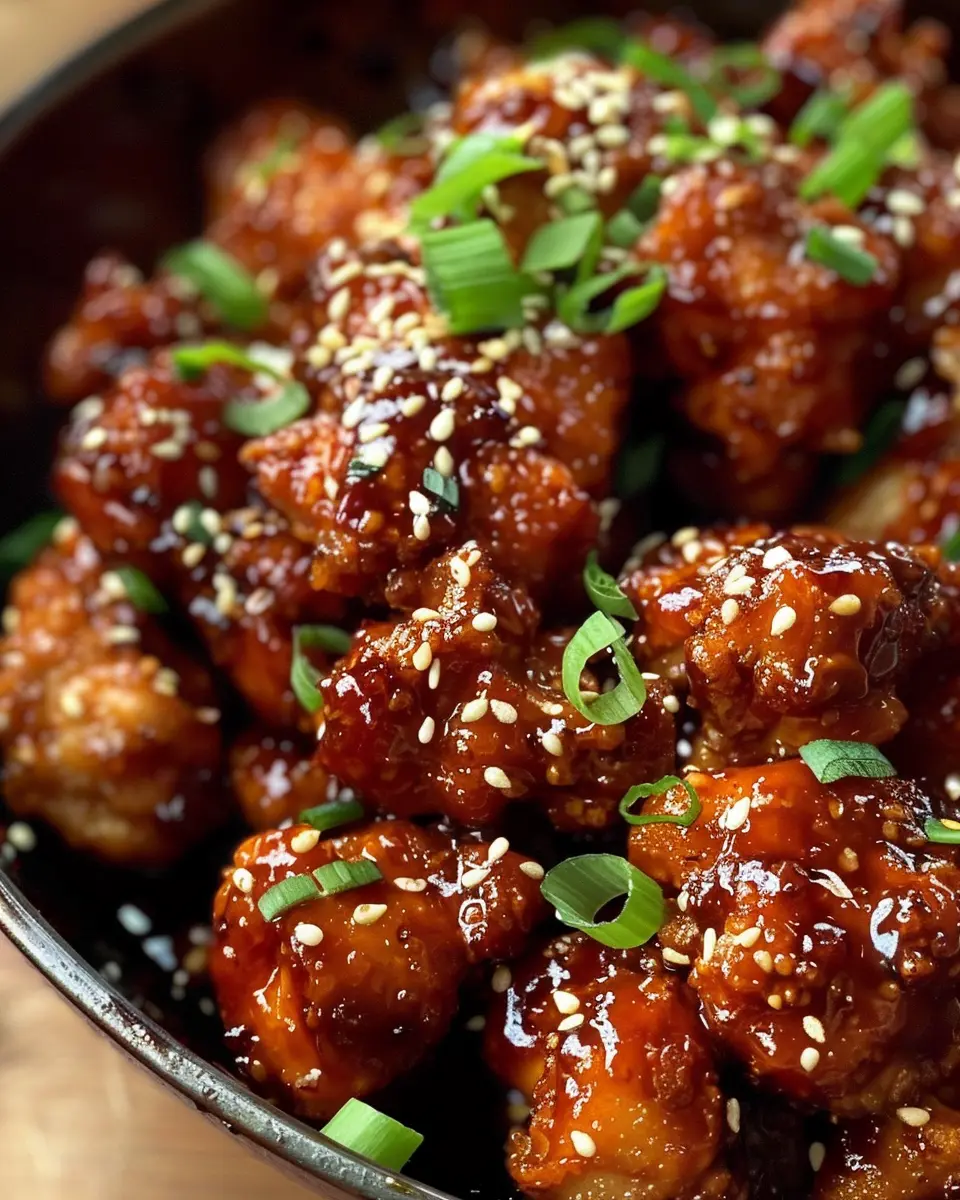 Once the chicken is fried to golden perfection, remove it from the oil and allow it to drain on paper towels. Now, it’s time for that heavenly sauce! In a large mixing bowl, combine the crispy chicken pieces with your prepared sauce. Gently toss the chicken until every piece is well-coated, ensuring that every bite bursts with flavor. For a touch of flair, sprinkle with sesame seeds and sliced green onions before serving.