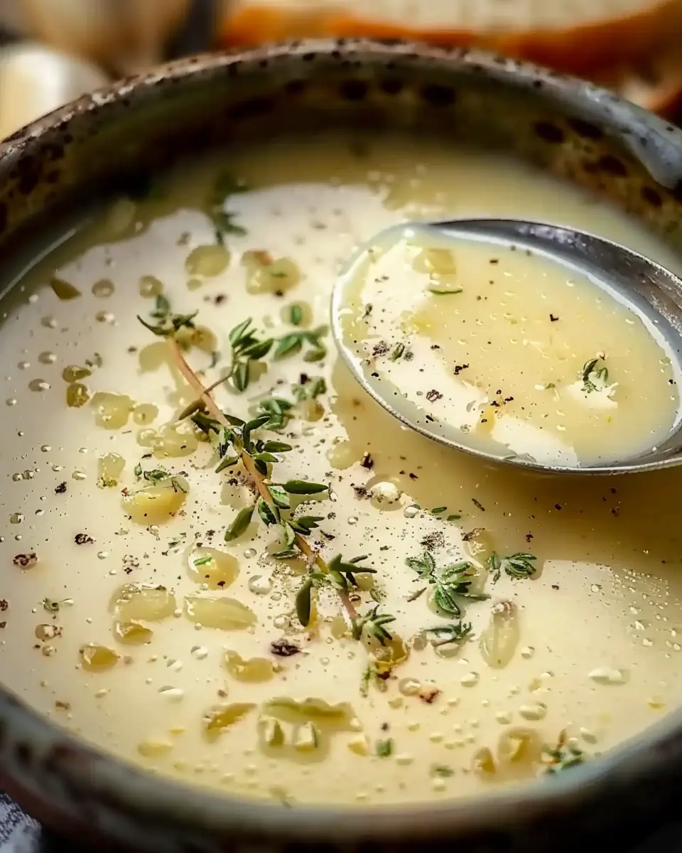 A savory and comforting soup that combines the rich flavors of garlic and turkey bacon, inspired by traditional French cuisine.