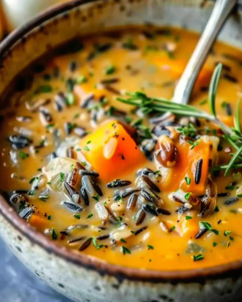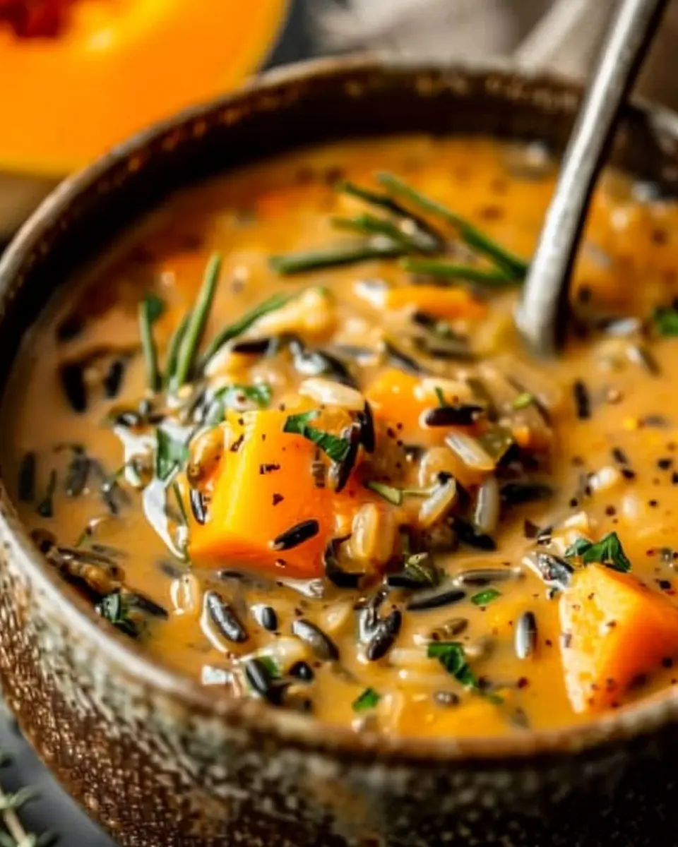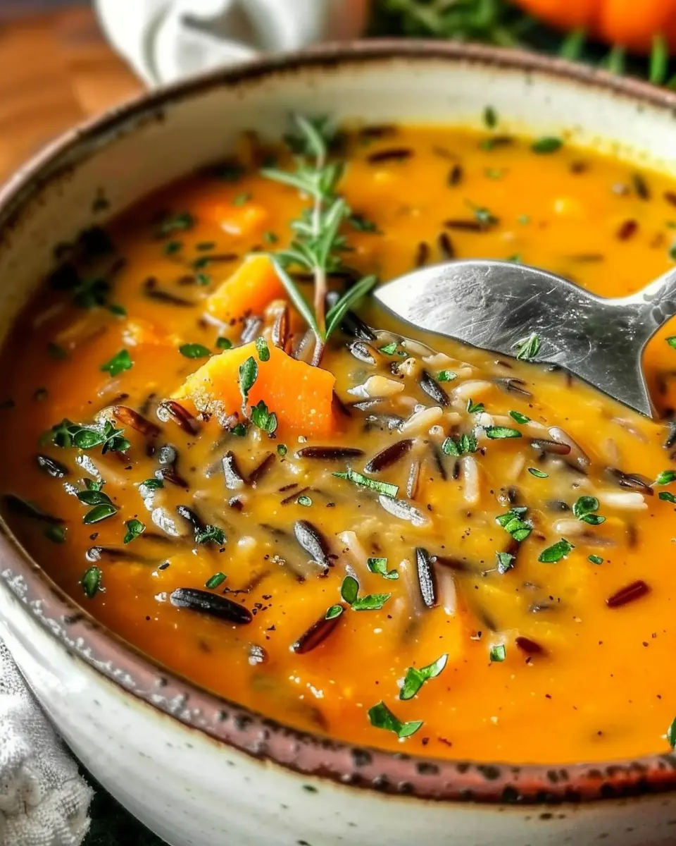A hearty and warming vegan soup that combines the rich flavors of pumpkin and wild rice.