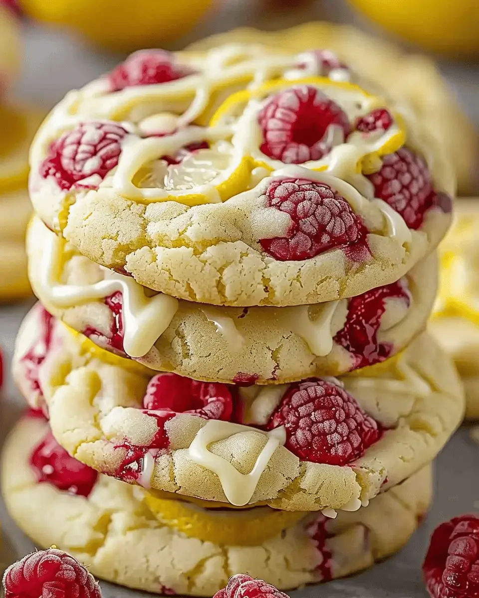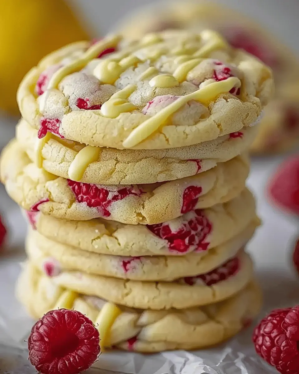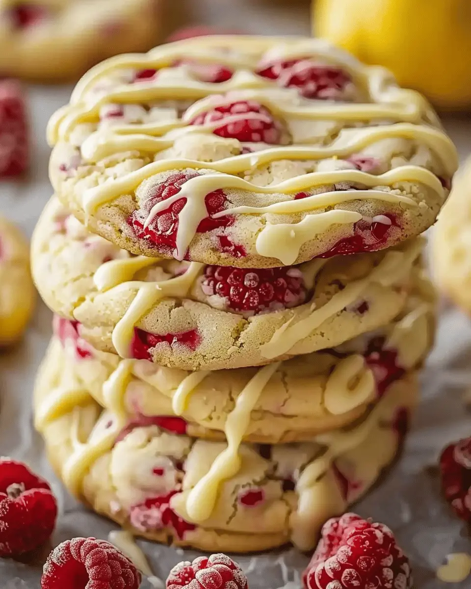 Discover the delightful combination of sweet white chocolate, tart lemon, and juicy raspberries in these amazing cookies.
